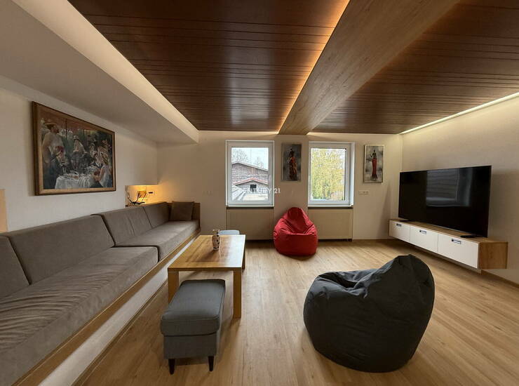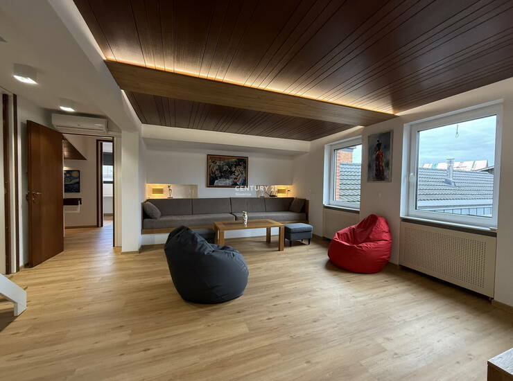 Na izjemno mirni lokaciji v Trnovem oddamo prostorno in popolnoma prenovljeno stanovanje v večstanovanjski hiši s tremi enotami. Stanovanje meri 124 m2 in je zasnovano premišljeno ter s poudarkom na udobju in kvaliteti bivanja. Obsega moderno kuhinjo z jedilnim delom in izhodom na balkon, veliko dnevno sobo, glavno kopalnico, dodatno sobo, ki se lahko uporablja kot spalnica ali domača pisarna, z lastno kopalnico, ter spalnico v zgornji etaži, kjer se nahaja tudi manjši kabinet in predsoba. Stanovanje je izredno svetlo in zračno, v celoti prenovljeno leta 2025. Opremljeno je s pohištvom izdelanim po meri, z luksuznimi materiali in visokokakovostno opremo (vključno s pralnim, sušilnim in pomivalnim strojem). Nahaja se v urejenem in mirnem predelu, le nekaj minut hoje od mestnega središča. V bližini so vse pomembne storitve – šola, vrtec, pošta, trgovina in postajališče LPP. Stanovanju pripada eno lastniško parkirno mesto pred hišo. Oddaja se popolnoma opremljeno in je vseljivo takoj. Najemnik prevzame v plačilo del dodatnih storitev posrednika in sestavo pogodbe, izvedbo primopredaje nepremičnine in sestavo zapisnika, pripravo in shranjevanje slikovnega gradiva, skladno s cenikom, navedenim v splošnih pogojih poslovanja nepremičninske agencije, tako da najemnik pri oglaševani najemnini in trajanju najema plača enkratno plačilo za dodatne storitve 1950 EUR. Želimo si mirne in urejene dolgoročne najemnike. Kajenje in hišni ljubljenčki niso dovoljeni.