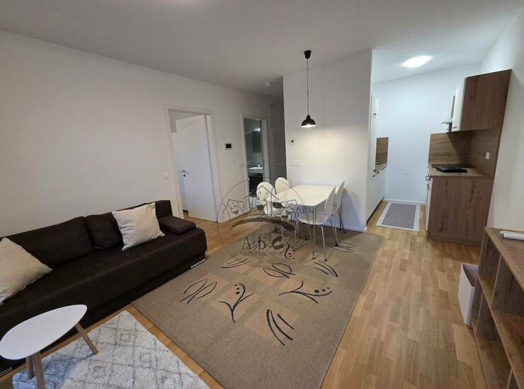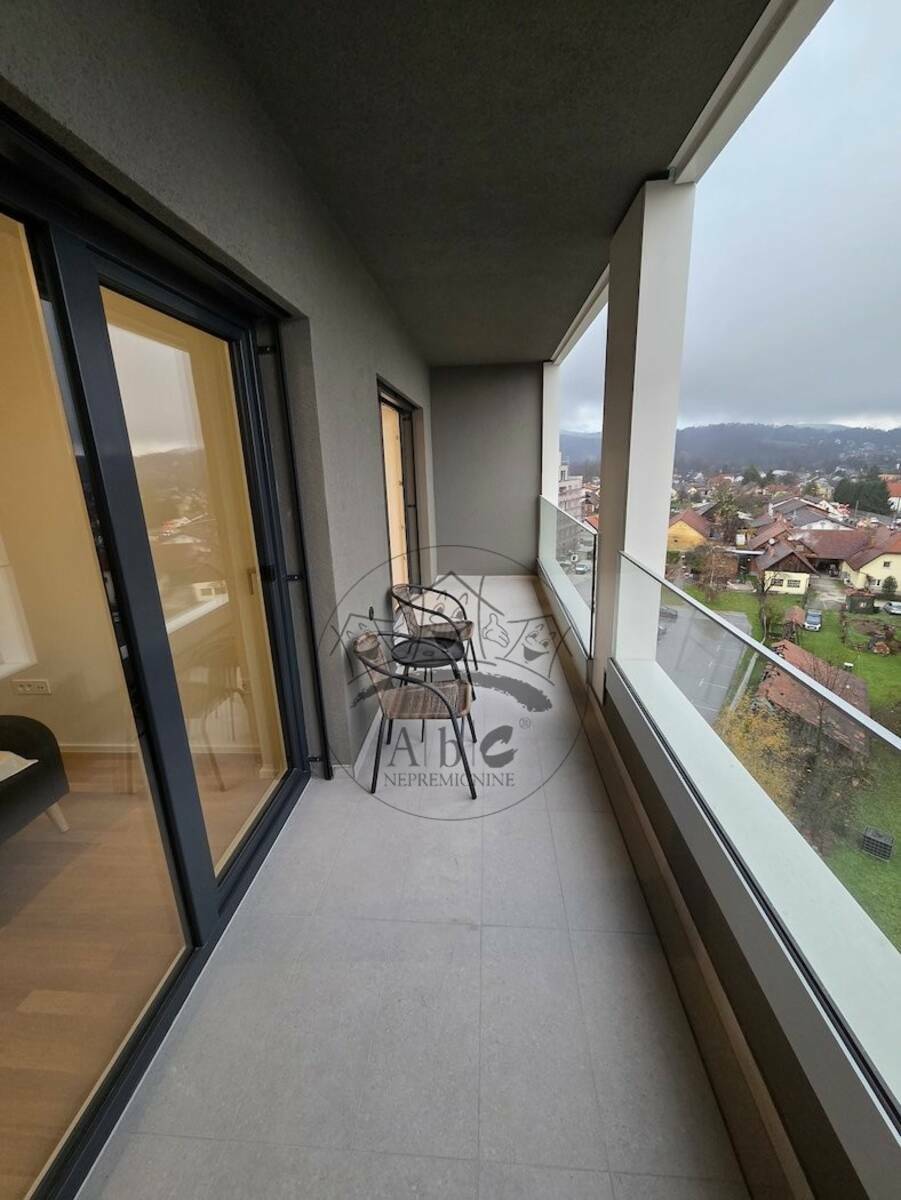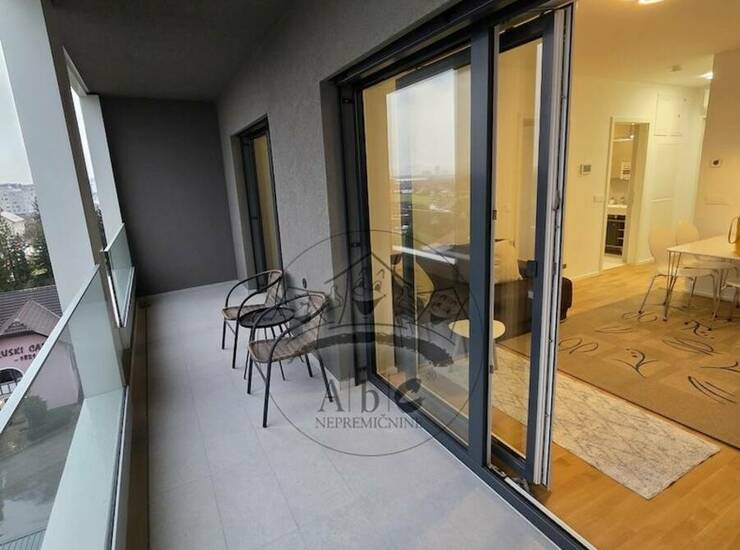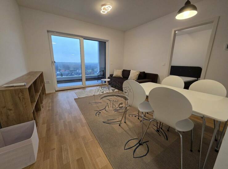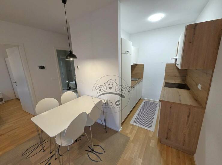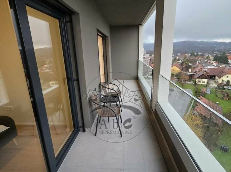 V 6. nadstropju na novo zgrajenega objekta z dvigalom oddamo manjše moderno dvosobno stanovanje z veliko ložo, pripadajočo shrambo in parkirnim mestom v garaži pod objektom.