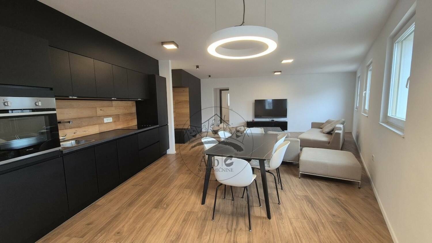 Oddaja se v celoti opremljeno (kot je razvidno s slik) z vso pripadajočo belo tehniko (kuhalna plošča, pečica, pomivalni stroj, hladilnik, pralni stroj).