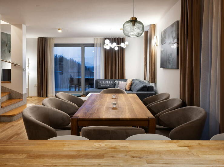 Prodaja nadstandardnega stanovanja s čudovitim razgledom na Blejsko jezero! Na izjemni lokaciji s čudovitim razgledom na Blejsko jezero se nahaja nadstandardno 4-sobno stanovanje v skupni izmeri 153 m2, razporejen v štirih etažah, s funkcionalnim zemljiščem velikosti 62 m2 in dvema parkirnima mestoma. Stanovanje je del stanovanjsko-turističnega objekta s tremi enotami, ki so vertikalno razporejene. Glavni vhod v objekt je skupen z ostalima dvema enotama in se nahaja v drugi etaži na zadnji strani stavbe. V prvi etaži vas pričakuje studio z zakonsko posteljo, ki vključuje sobo z infrardečo savno, moderno kopalnico z veliko tuš kabino, WC-jem in pralnim strojem, utility ter prostorno teraso. Druga etaža je zasnovana kot velik odprt prostor, ki povezuje kuhinjo, jedilnico in dnevno sobo. Iz dnevne sobe je dostop do terase s prekrasnim razgledom na Blejsko jezero. Kuhinja je popolnoma opremljena z vsemi sodobnimi aparati in velikim kuhinjskim otokom, od koder je dostop do stranske terase. V tej etaži se nahajata tudi ločen WC in vhodni prostor. V tretji etaži se nahajata dvoposteljna soba in prostorna, svetla spalnica, obe z balkonom. Nad spalnico se v četrti etaži nahaja galerija, ki ponuja prostor za dve ležišči s francoskim balkonom. Tretja etaža obsega tudi kopalnico z WC-jem in hodnik. K stanovanju pripadata tudi skupni hodnik in skupni tehnični prostor. Odlična razporeditev omogoča enostavno delitev na dve ločeni enoti. Nepremičnina je opremljena s toplovodnim talnim gretjem na plin. Klimatizirana je s klimatskimi napravami v spalnici, galeriji, dvoposteljni sobi in dnevni sobi, kjer je tudi možnost namestitve kamina. Klimatske naprave zagotavljajo tako hlajenje kot ogrevanje. Okna so lesena, dvoslojna in opremljena z zunanjimi električnimi žaluzijami, medtem ko so strešna okna opremljena z notranjimi pliseji. Vhodna vrata so masivna in protivlomna. Talne obloge so parket in keramične ploščice v kopalnici, WC-
