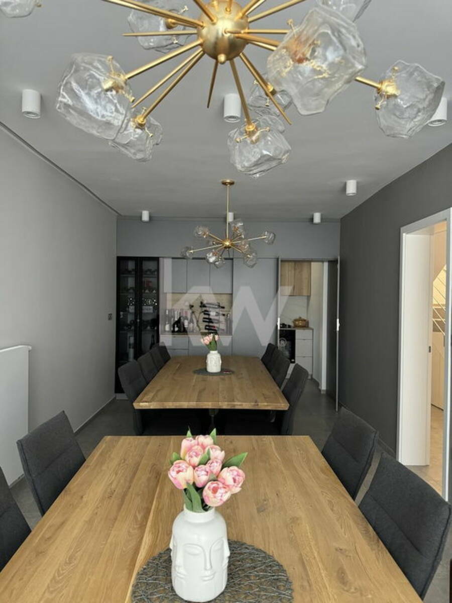 Hiša je zasnovana kot trietažna z možnostjo 3 stanovanjskih enot, trenutno pa zajema 2 kuhinji, 3 kopalnice in 3 dnevne sobe, 4 spalnice, fitnes sobo, sobo za druženje, sobo za goste, utility, ločene sanitarije, dodaten wc za goste itd. V srednji etaži je na voljo tudi ločen poslovni prostor, ki vam omogoča opravljanje dejavnosti od doma.