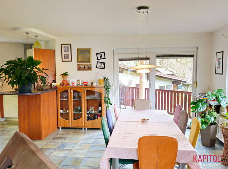 v nadstropju so spalni prostori (spalnica, velika otroška soba), kopalnica s kotno kadjo, garderobna soba ter manjša pisarn