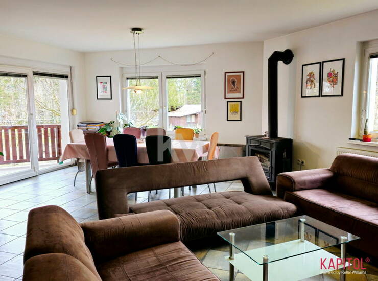 v visokem pritličju se nahaja velik bivalni prostor – dnevna soba, kuhinja z jedilnico in kopalnica z WC in tuš kabino;