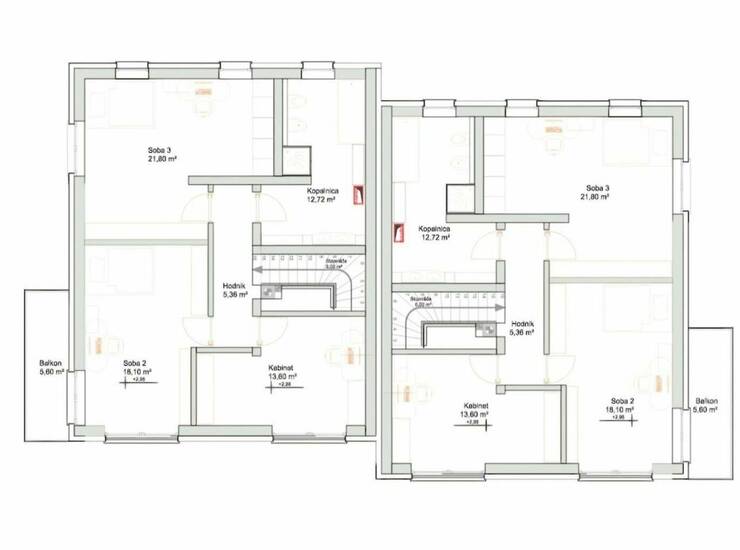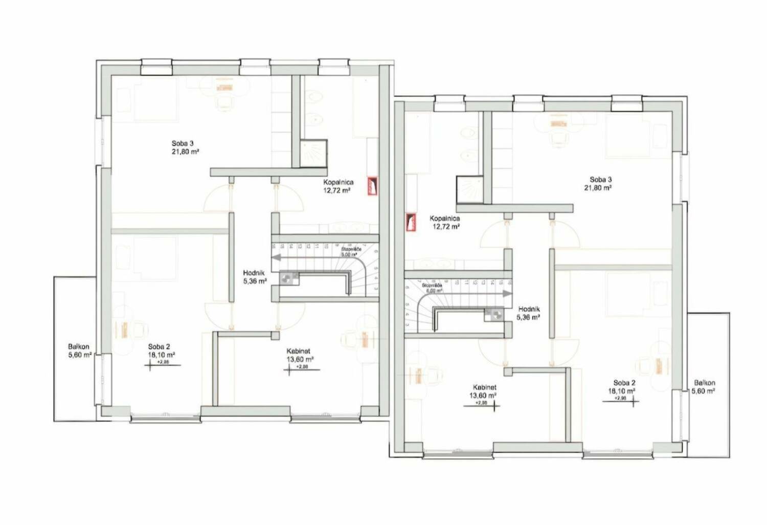 Tloris prostorov objekta se nahaja med fotografijami v oglasu in v pritličju obsega 82,22m2 ter v nadstropju 80,60m2. Vsaka enota dvojčka ima skupno 4 spalnice in 2 kopalnici, zaradi česar je zelo primerna za družine.