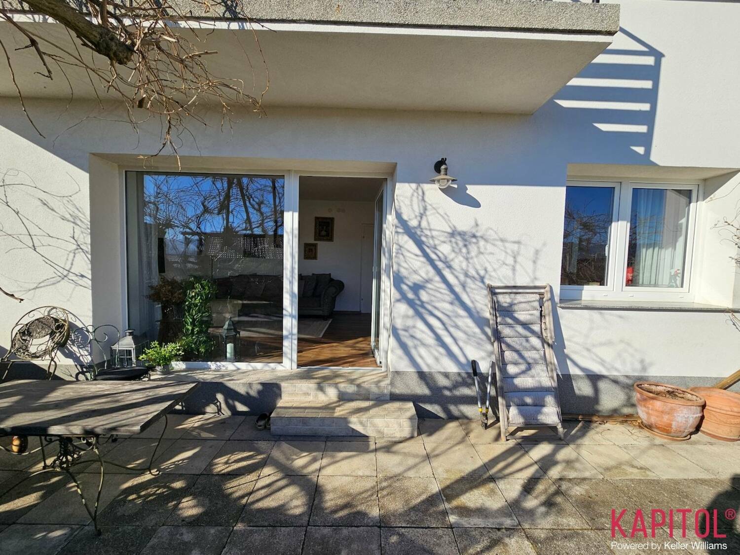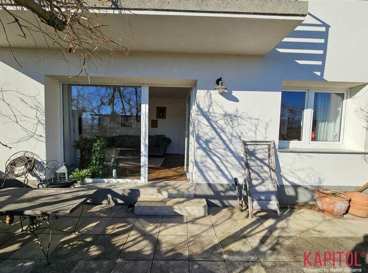 2. Zgornje stanovanje je v dveh etažah: jedilnica s pogledom na vrt, dnevna soba s kaminom, vgrajenimi knjižnici policami in izhodom na sončno teraso, kuhinja, kopalnica z wc-jem in veliko masažno kopalno kadjo in tri sobe (prva se je uporabl