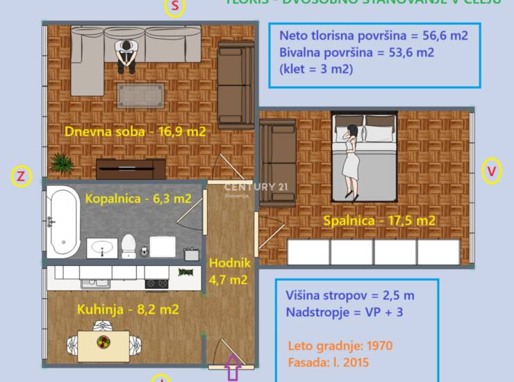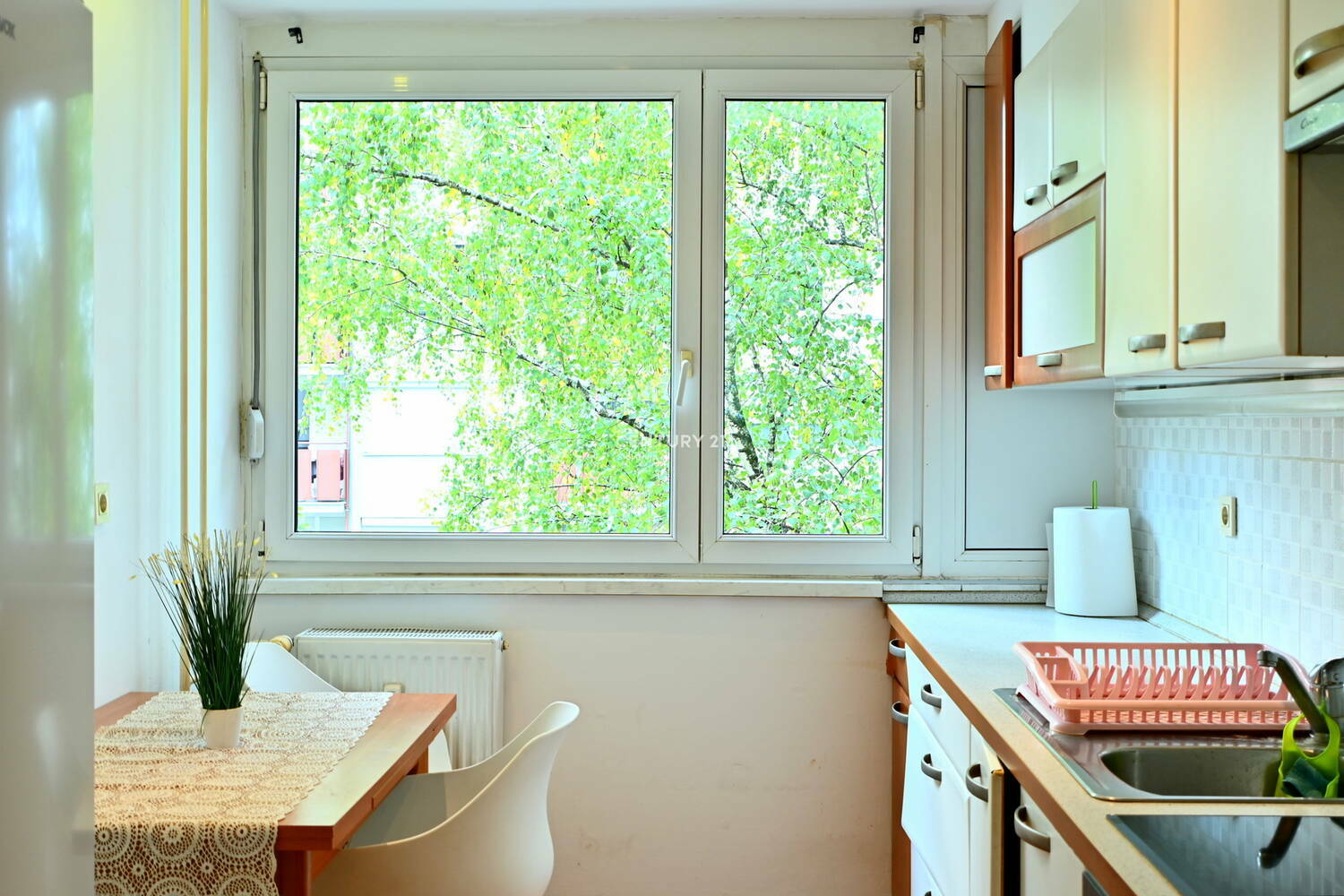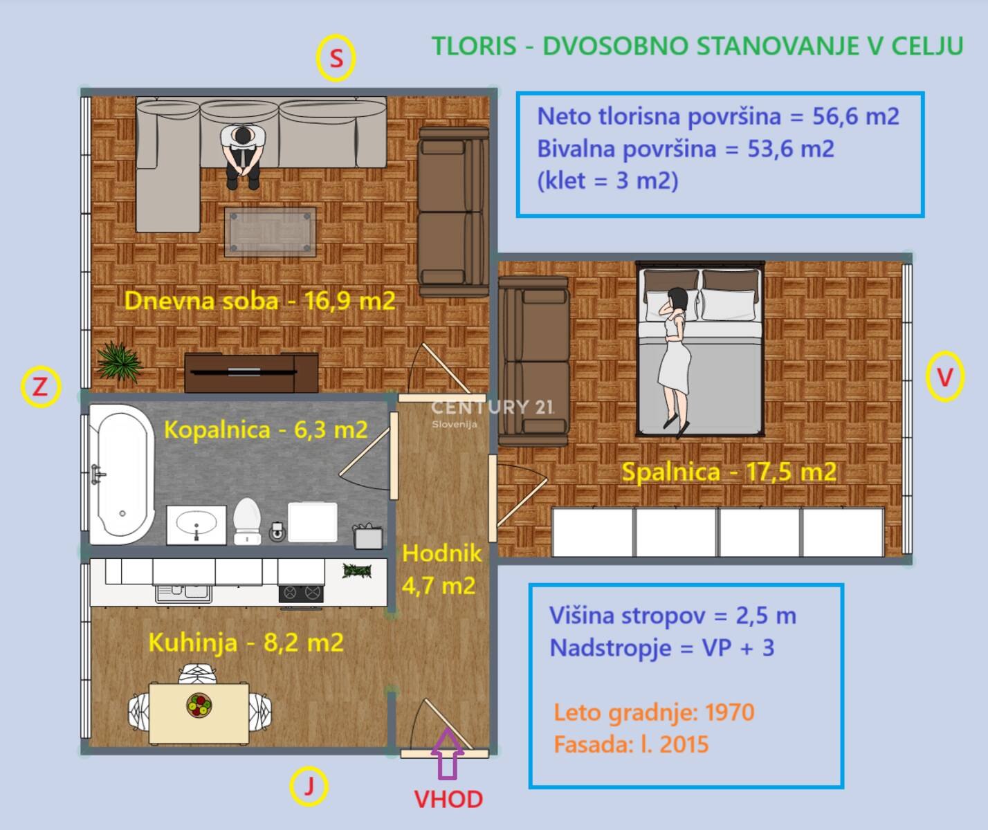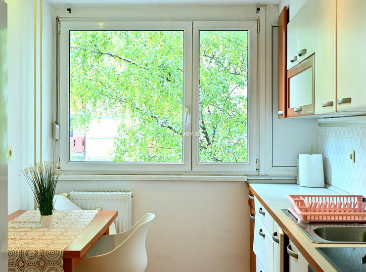 Na eni izmed najbolj priljubljenih in iskanih lokacij v Celju – na Vojkovi ulici – je na voljo prostorno, svetlo in v celoti opremljeno 2-sobno stanovanje, ki predstavlja odlično priložnost za bivanje ali investicijo. Stanovanje meri 56,6 m2 neto tlorisne površine (od tega 53,6 m2 bivalne površine) in se nahaja v 3. nadstropju (VP+3) lepo vzdrževanega večstanovanjskega bloka brez dvigala, zgrajenega leta 1970. Stanovanje nima balkona, vendar nudi čudovit razgled na obe strani objekta – vzhod in zahod, kar omogoča veliko naravne svetlobe skozi ves dan. Parkiranje je omogočeno na večjem skupnem parkirišču pred objektom. Nizki mesečni stroški: poleti cca 150 €, pozimi cca 220 €. Stavba je obnovljena, brez predvidenih novih investicij. Video - https://youtu.be/ZmcrFny65nA Prostori: hodnik (4,7 m2), kopalnica (6,3 m2), kuhinja z jedilnico (8,2 m2), velika spalnica (17,5 m2), dnevna soba (16,9 m2), kletna shramba (3 m2), skupna kolesarnica in sušilnica. Višina stropov: 2,5 m. Strop v dnevni sobi je bil spuščen, zaradi ambientalne osvetlitve. 360 pogled - https://kuula.co/share/collection/7Dy9G?logo=1&info=0&fs=1&vr=1&initload=0&autorotate=0.34&thumbs=1 OBNOVE IN OPREMA: Fasada obnovljena leta 2015 (30 cm izolacije + dodatna 5 cm notranja izolacija zunanjih sten) Streha zamenjana leta 2000 PVC okna (termopan, dvoslojna), zamenjana l. 2010 Nova protivlomna vhodna vrata Prenovljena kopalnica (l. 2005) Elektrika prenovljena – nova elektro omarica z avtomatskimi varovalkami Nova sanitarna oprema in bojler (80 L, zamenjan l. 2020) Zamenjani radiatorji Klimatska naprava Panasonic (l. 2015) Talne obloge: parket v sobah, laminat v kuhinji in hodniku, keramika v kopalnici Priključki: optika, kabelska, telefon Ogrevanje: centralno, daljinsko (toplovod) Topla voda se ogreva z 80 L električnim bojlerjem (l. 2020) Stanovanje se prodaja z vso lastniško opremo LOKACIJA, KI PREPRIČA: Vojkova ulica je sinonim za udobno