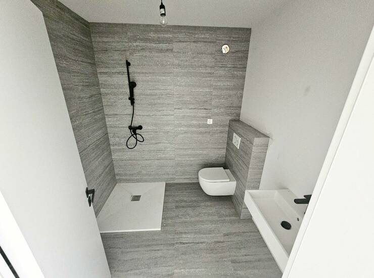 Finalni tlaki prvovrsten finalno lakiran hrastov parket v videzu surovega lesa, talna in stenska keramika v videzu travertino, finalni oplesk sten in stropov.