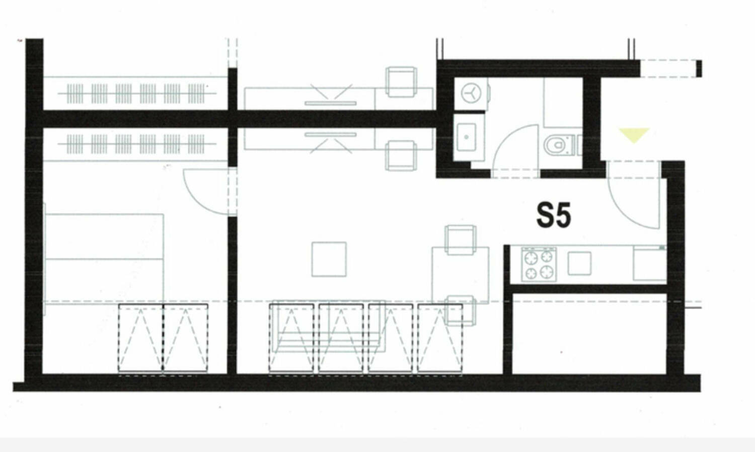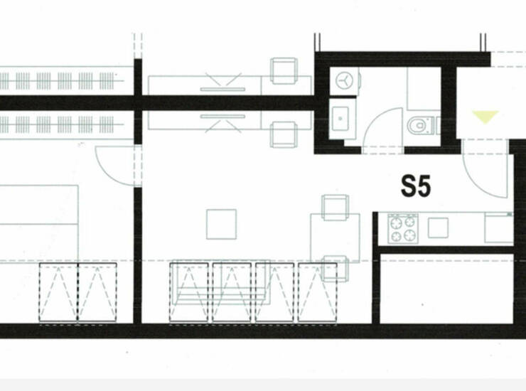 Funkcionalen razpored bivalnih prostorov obsega odprt dnevno-bivalni prostor s kuhinjskim in jedilnim delom, ločeno spalnico in kopalnico.