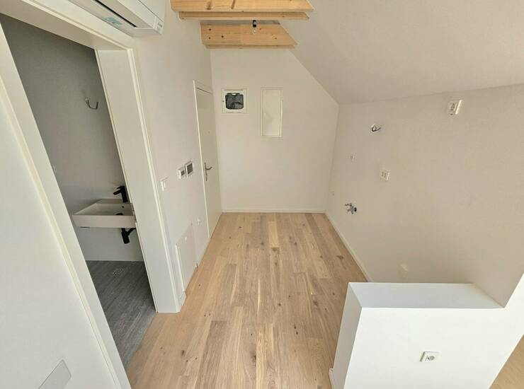 Finalni tlaki prvovrsten finalno lakiran hrastov parket v videzu surovega lesa, talna in stenska keramika v videzu travertino, finalni oplesk sten in stropov.