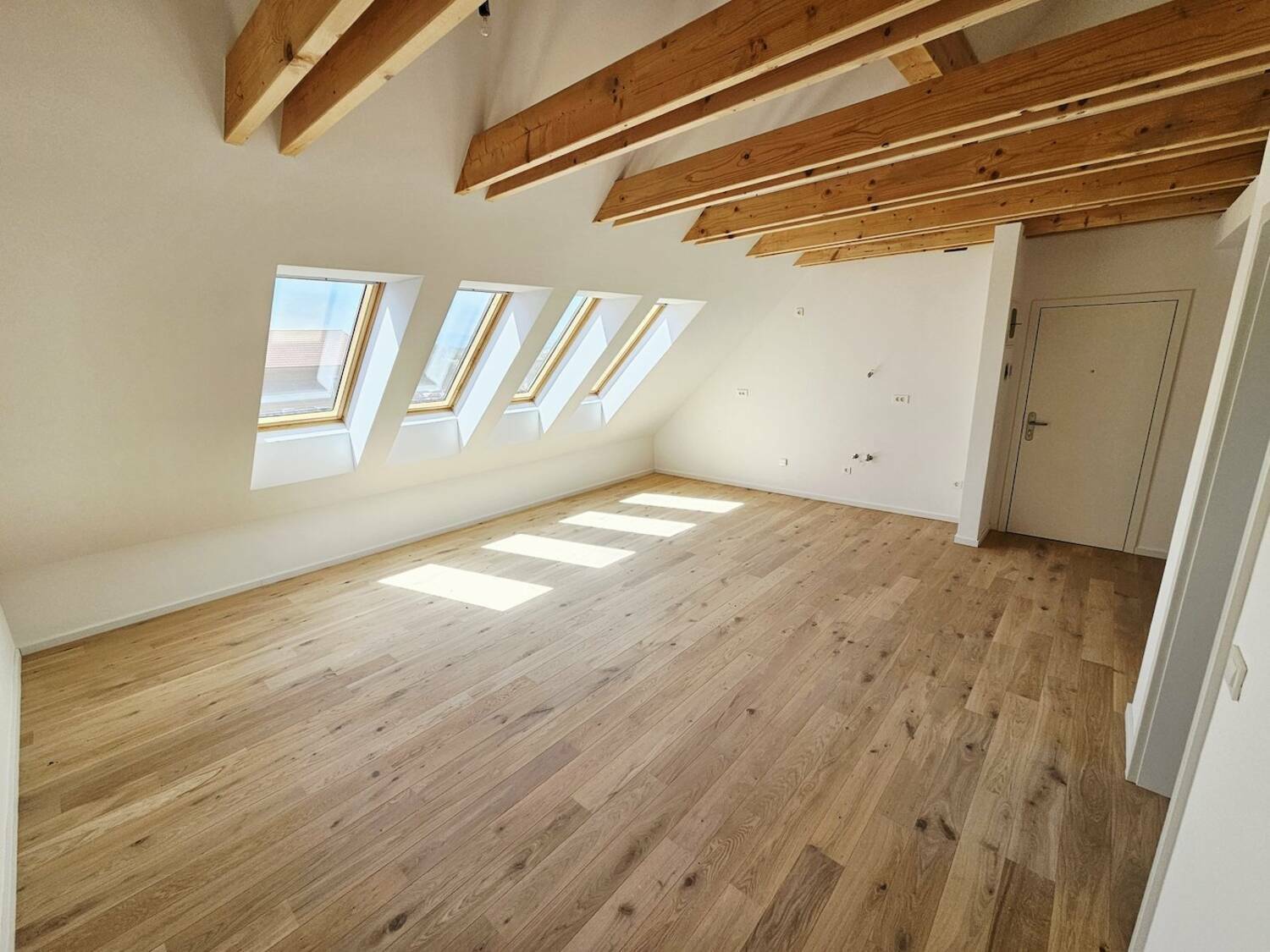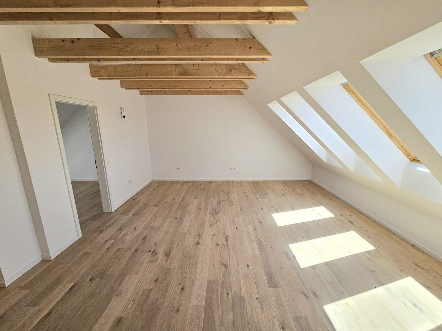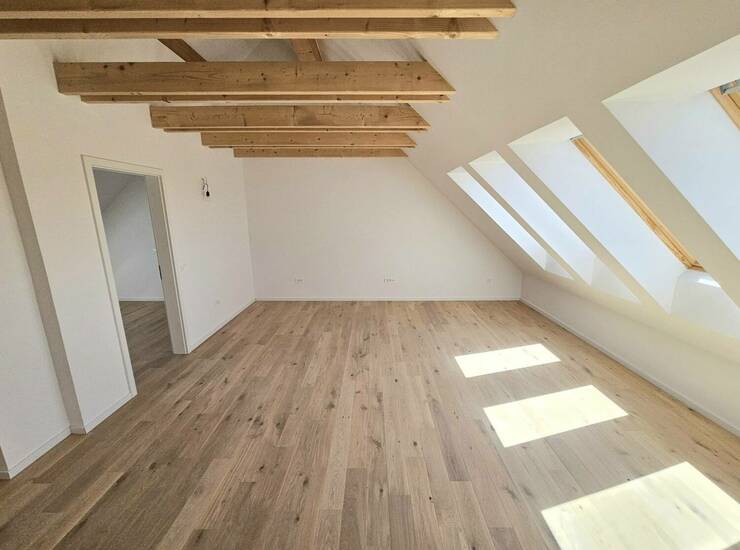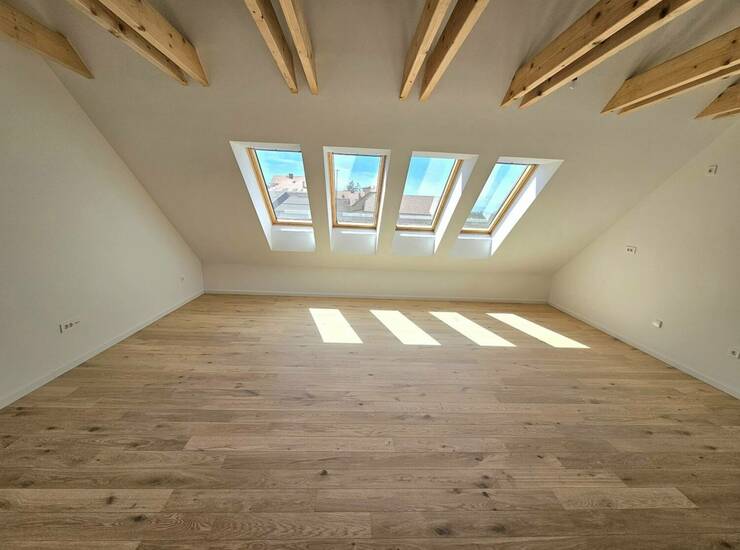 Finalni tlaki prvovrsten finalno lakiran hrastov parket v videzu surovega lesa, talna in stenska keramika v videzu travertino, finalni oplesk sten in stropov.