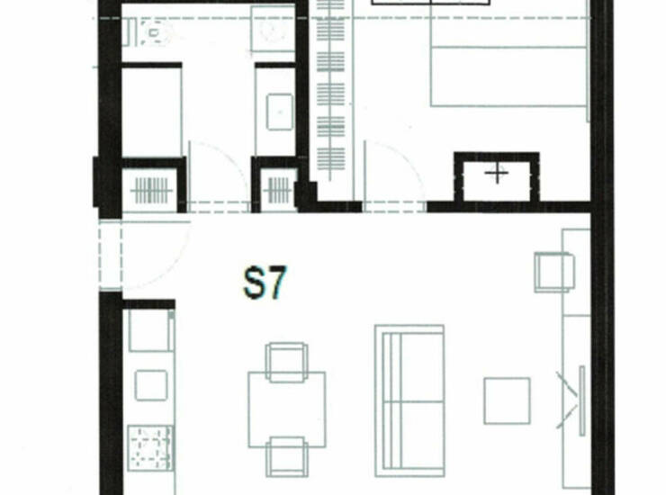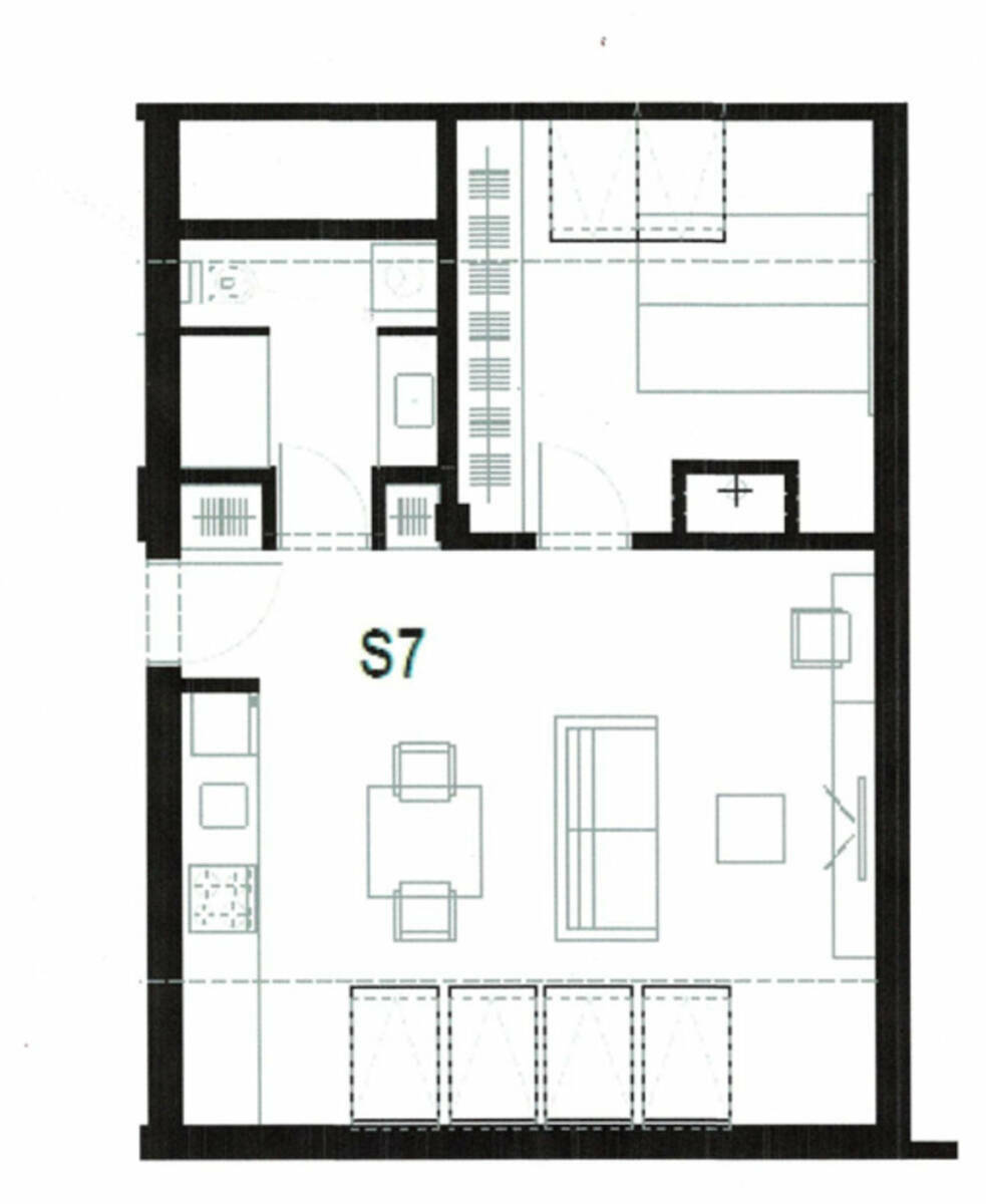 Funkcionalen razpored bivalnih prostorov obsega odprt dnevno-bivalni prostor s kuhinjskim in jedilnim delom, ločeno spalnico in kopalnico.
