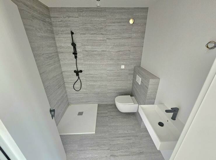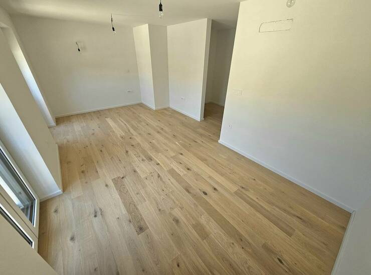 Finalni tlaki prvovrsten finalno lakiran hrastov parket v videzu surovega lesa, talna in stenska keramika v videzu travertino, finalni oplesk sten in stropov.