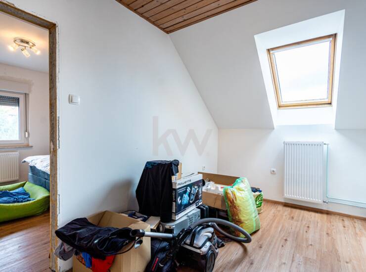 Nadstropje vključuje kuhinjo z jedilnico, dnevno sobo ter dve spalnici in otroško sobo, dnevno sobo,katera ima izhod na balkon, ter renovirano kopalnico in WC, ter celotna hiša ima nove talne obloge.