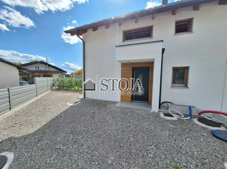 Na prodaj enota dvojčka-nizkoenergijska hiša Marles. Zgrajena do 4 gradbene faze. Urejena je fasada s toplotnim ovojem. V hiši so urejeni priključki ter razpeljava-inštalacije za vodo, elektriko ter internet. Lastnik bo moral urediti še fine obloge tal ter sten ter montirati toplotno črpalko za gretje in hlajene hiše. Dokončati je treba tudi kopalnice. Hiša-Marles, je grajena v alpskem stilu-simetrična dvokapnica. Hiša ima vgrajen dimnik za kamin.Okvirna cena za dokončanje šr cca 50.000 evrovRazporeditev: pritličje s površino 68 m2: kopalnica, kabinet, shramba, kuhinja z jedilnico, dnevni prostor, utility, hodnik in vhod- nadstropje 66 m2: dve otroški sobi, kopalnica, spalnica, garderoba, kopalnica, hodnik- mansarda v izmeri 10 m2: prostor za druženje oz večja soba.V pritličju je izhod iz dnevnega prostora na teraso v izmeri 34 m2, ki je nadkrita s pergolo.Dostop do obeh enot, ki se nahaja na vzhodni strani, je zagotovljen iz javne ceste. Na dvorišču so predvidena parkirna mesta (delno pokrita) za stanovalce in obiskovalce.Ogrevanje je predvideno s toplotno črpalko. Enota dvojčka bo priključena na vodovodno, električno in kanalizacijsko in telekomunikacijsko omrežje.Ostali konstrukcijski elementi:- Zunanje stavbno pohištvo: Kakovostna lesena okna/balkonska vrata so izdelana iz visokokakovostnega večslojnega lepljenega macesnovega lesa, ki je odporen na UV žarke. Okna so troslojna z vgrajenimi senčili in električnimi ALU žaluzijami. Ekskluzivna aluminijasta vhodna vrata znamke INOTHERM bodo opremljena s 5-točkovno varnostno ključavnico in varnostnim cilindrom.- Streha: Dvokapna kritina BRAMAC. Strešna okna so izvedena v naravnem lesu s panoramskim odpiranjem.Stanovanjska stavba zgrajena do 4. gradbene faze. Navedena cena vključuje 9,5 % DDV.Makro lokacija naselja omogoča kakovostno družinsko bivanje, saj je v bližini vsa potrebna infrastruktura:- center Domžal je oddaljen 700 metrov, kjer se nahajaj