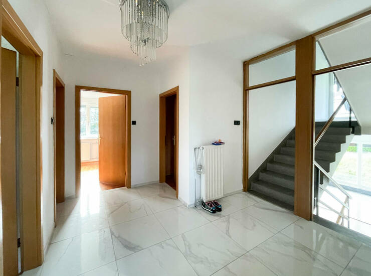 Na osončeni in mirni lokaciji le slab kilometer oddaljeni od centra Domžal, prodamo prostorno kvalitetno grajeno samostojno hišo zgrajeno l. 1970, ki je delno obnovljena. Enostanovanjska hiša (možnost preureditve v dvostanovanjsko) se nahaja na zemljišču velikem 2.881 m2 in ima tri etaže. Zemjišče je podolgovate pravokotne oblike (sestavljata ga dve ločeni parceli in skupaj je zazidljivega zemljišča 1.137 m2), v celoti ograjeno in je funkcionalno razporejeno okoli hiše. Dostop je urejen direktno z javne ulice. Za hišo stoji še 60 m2 velik pomožni objekt – dvojna garaža. Velik investicijski potencial z možnostjo gradnje dodatnih objektov.