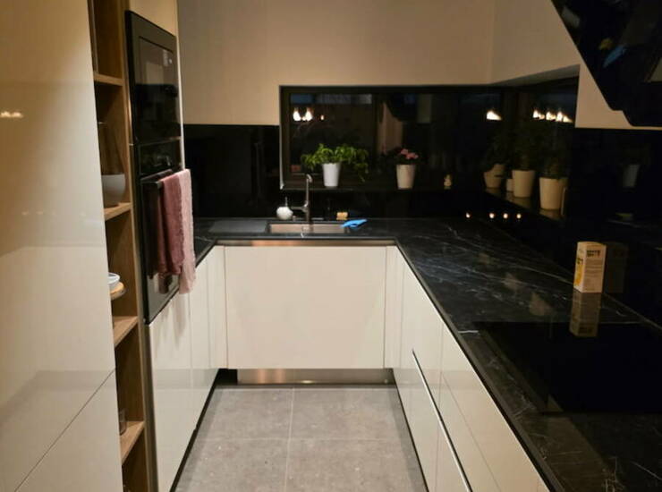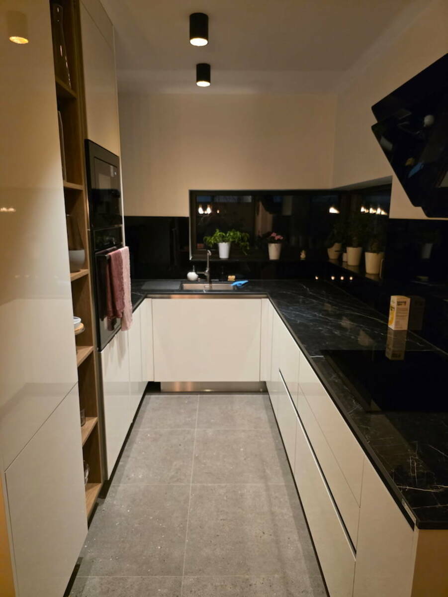 - pritličje: vstopni hodnik, dnevni wc, kabinet/delovna soba, sušilnica, velik dnevno bivalni prostor povezan z kuhinjo in z izhodom na vrt. Talna obloga je keramika.
