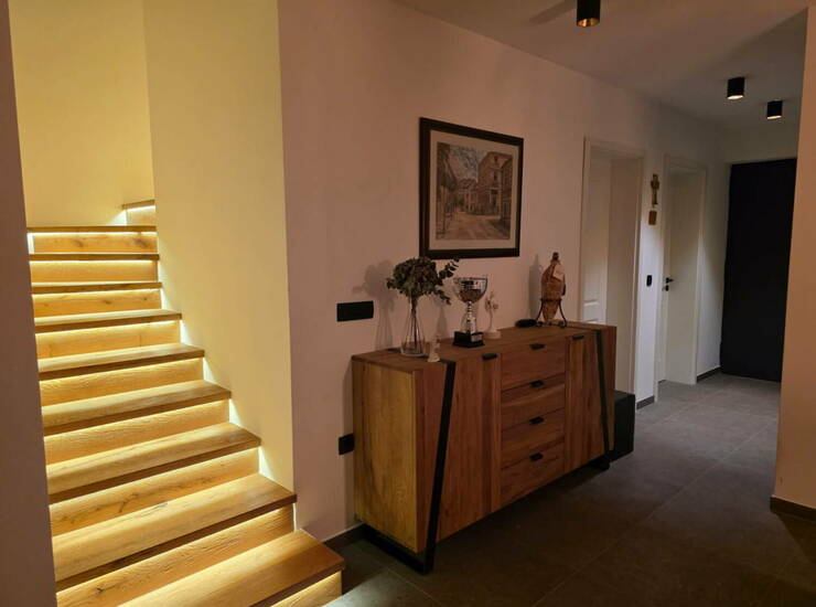 Hiša je bila zgrajena leta 2022 in je praktično novogradnja, hiša je opremljena z opremo višjega cenovnega razreda in se prodaja kompletno opremljena (kuhinja z vsemi elementi in aparati, dnevna soba, miza s stoli, tri opremljene spalnice, ena s savno). Hiša je grajena s 20cm fasadno izolacijo in spada v B2 energetski razred, ima tri slojna pvc okna z žaluzijami in vhodna vrata Pirnar, odklepanje s prstnim odtisom. Ob izhodu na vrt je postavljena pergola Pirnar (5mx3,5m) z zip senčili. Okoli hiše je postavljena panelna ograja in električna drsna vrata za dostop na parkirišče. Na vrtu je zunanja lopa za shranjevanje orodja in koles.