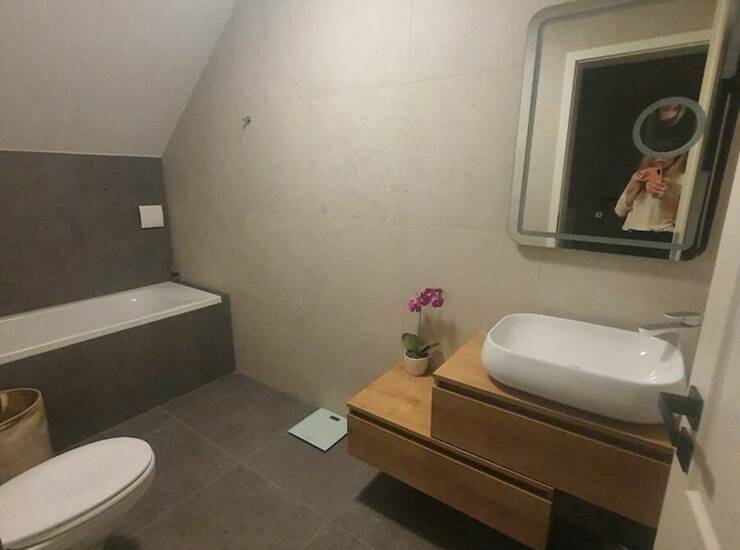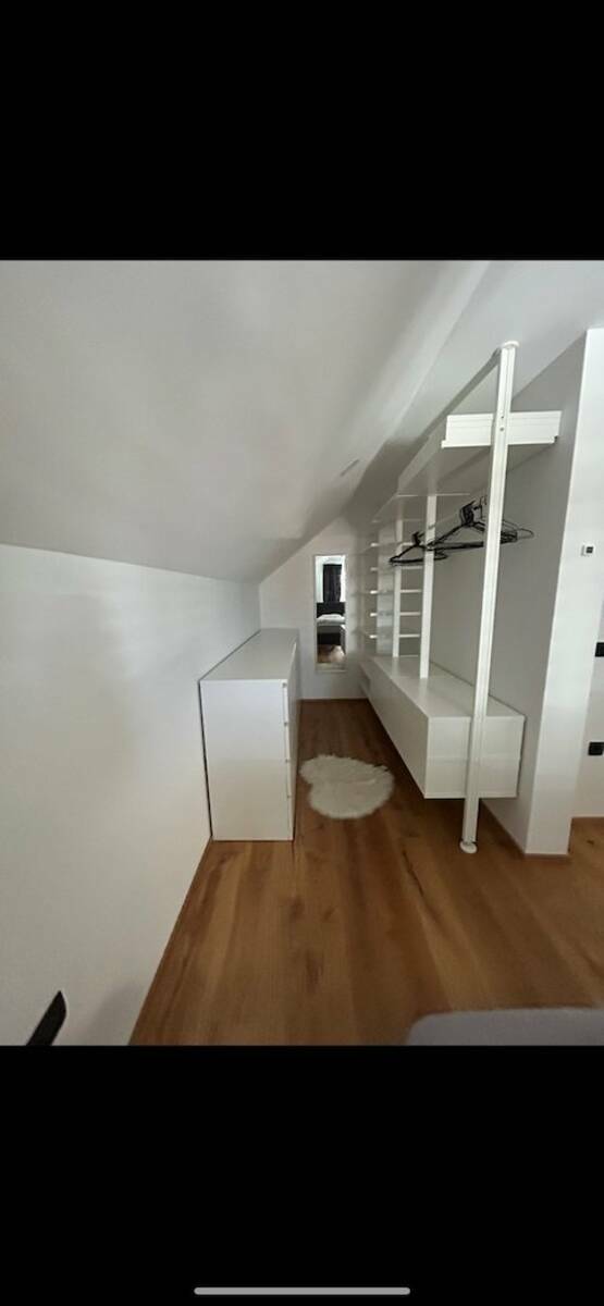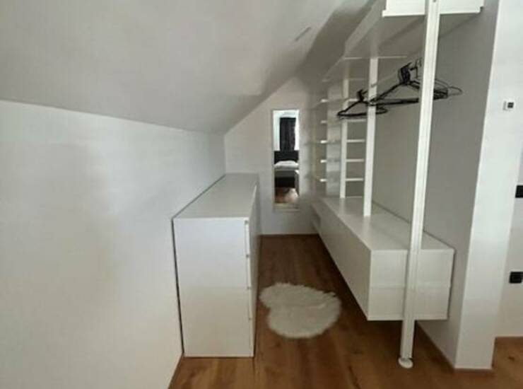 - 1. nadstropje: velika spalnica z lastno kopalnico in garderobno sobo, dve spalnici in kopalnica. Talna obloga je krtačen parket.