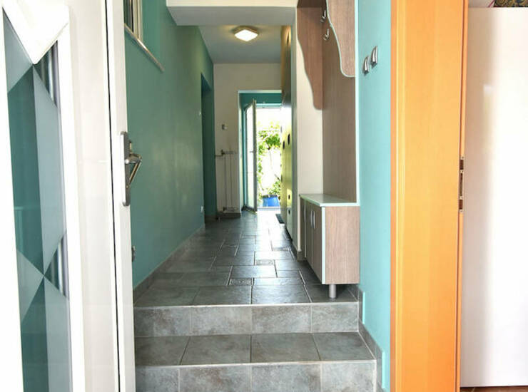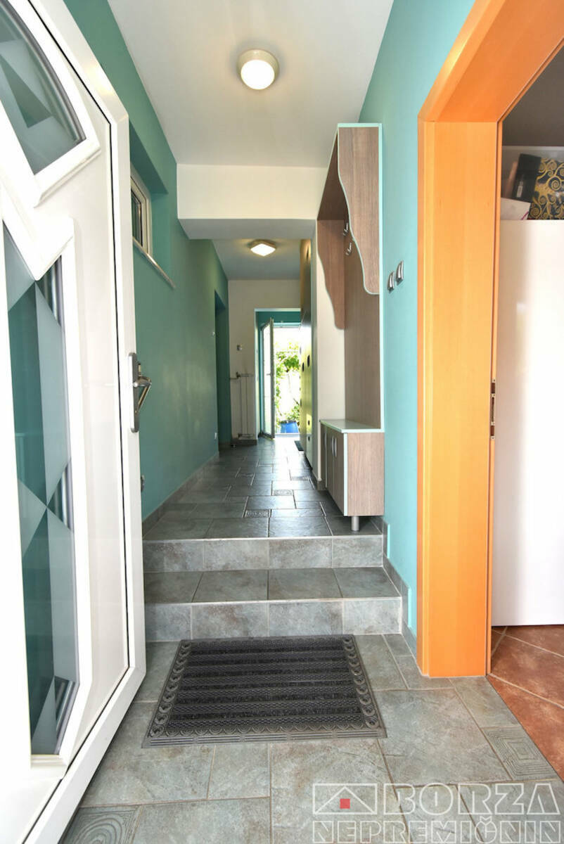 prvo nadstropje: hodnik, kuhinja, dnevna soba, spalnica, manjša soba in kopalnica z wc-jem. Na koncu hodnika etaže je izhod na urejeno teraso. V tem nadstropju hiše je glavni vhod za obe bivalni etaži. V tem nivoju hiše nad garažo se še nahaja druga terasa, ki je ograjena, kjer si lahko uredite zastekljen letni vrt.