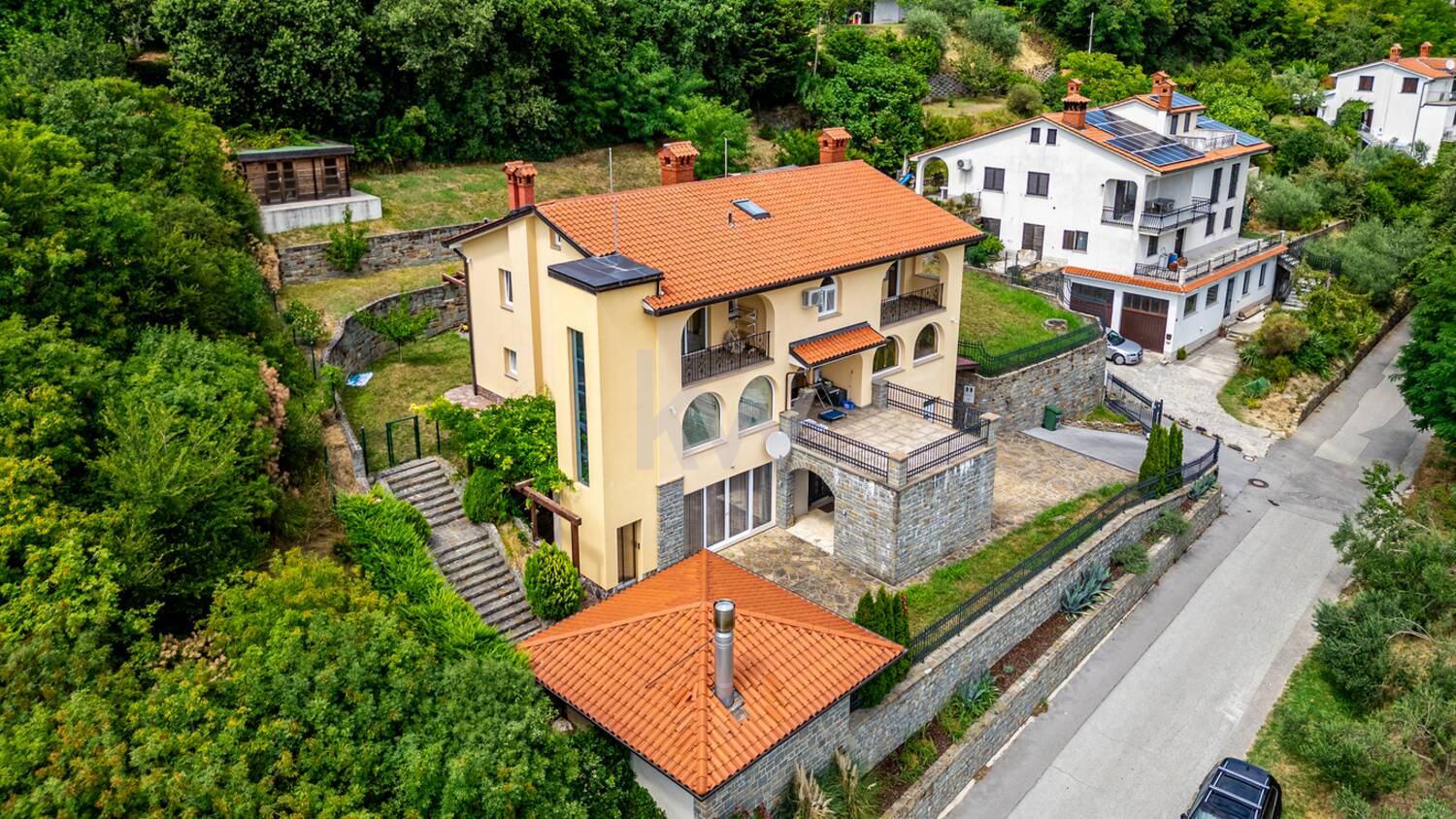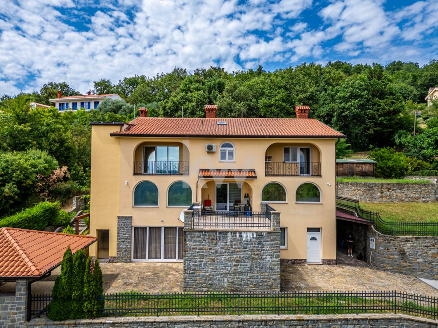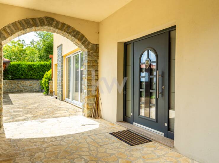 Predstavljamo individualni stanovanjski objekt, ki ima tri ločene bivalne dele in je kakovostno grajen ter ima veliko nadstandardnih detajlov. Velikost zemljišča je 1443 m2 in neto tlorisna površina dela stavbe je 424,4 m2 (bivalni prostor 346,90 m2, shrambe 34,10 m2 in balkoni 43,40 m2). Konfiguracija terena je v naklonu iz višje severne strani proti nižjim južnim stranem. Pred hišo se nahaja nadkrita letna kuhinja in vrt s parkirišči. Za hišo pa se razprostira veliko urejeno dvorišče z dvema enostavnima lesenima objektoma, kjer je bil predviden tudi bazen. Ker so za hišo izvedene terase, so sezidani kamniti podporni zidovi. Celotna nepremičnina je ograjena in pod videonadzorom ter varovana z alarmnim sistemom. Hlajenje je urejeno s klimatskimi napravami (8x) in gretje je urejeno s toplotno črpalko (talno gretje). Nepremičnina ima tudi gradbeno dovoljenje in vso infrastrukturo individualne rabe (telefonijo, vodovod, elektro..). Nadstropja so med seboj povezana z internimi stopnicam in z dvigalom (ki vodi v vse etaže). Dostop do nepremičnine je urejen neposredno iz javne ceste. Nepremičnina nudi neomejene možnosti, bodisi kot družinska hiša ali kot priložnost za investicijo, zato ima velik potencial.