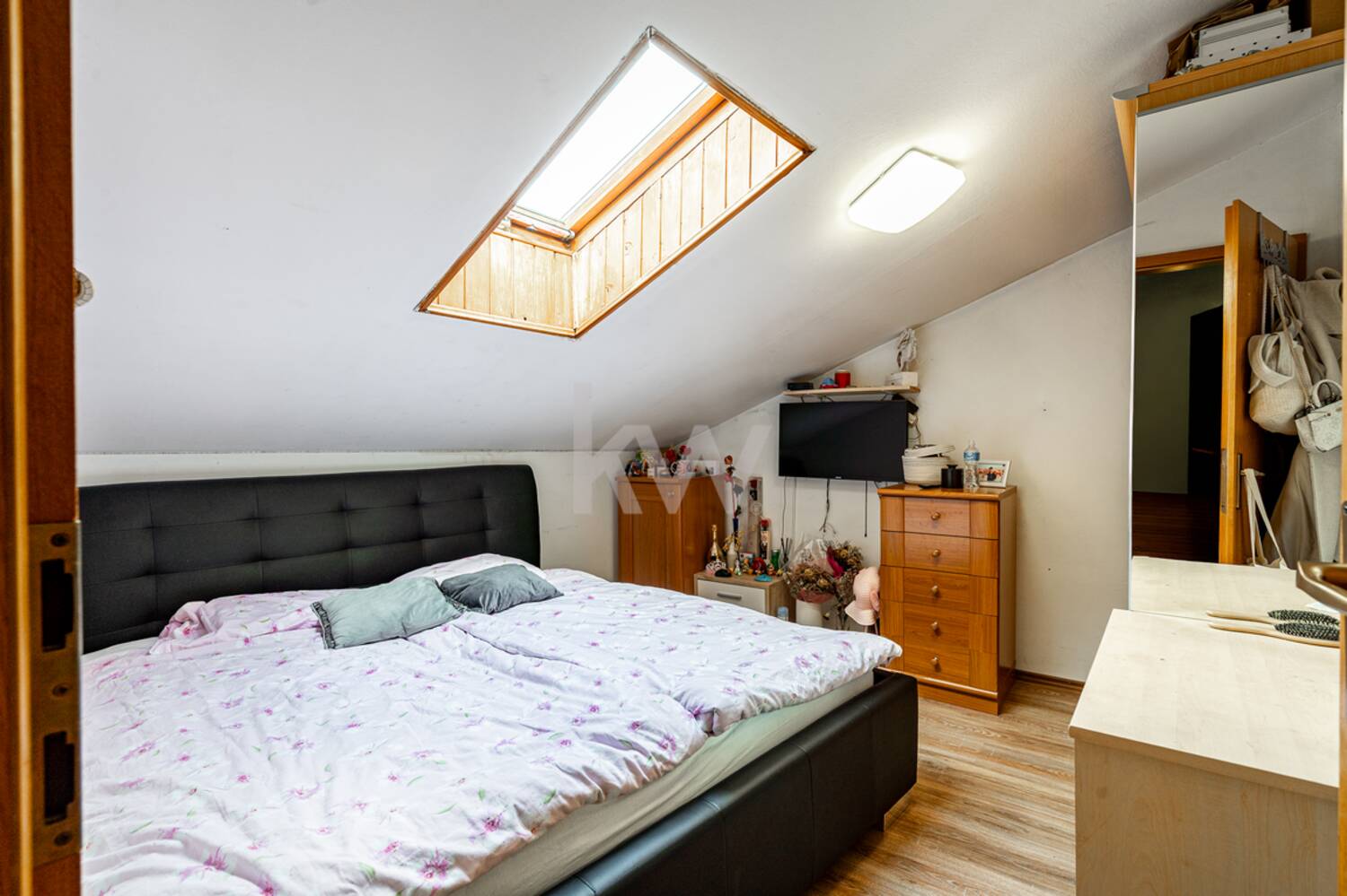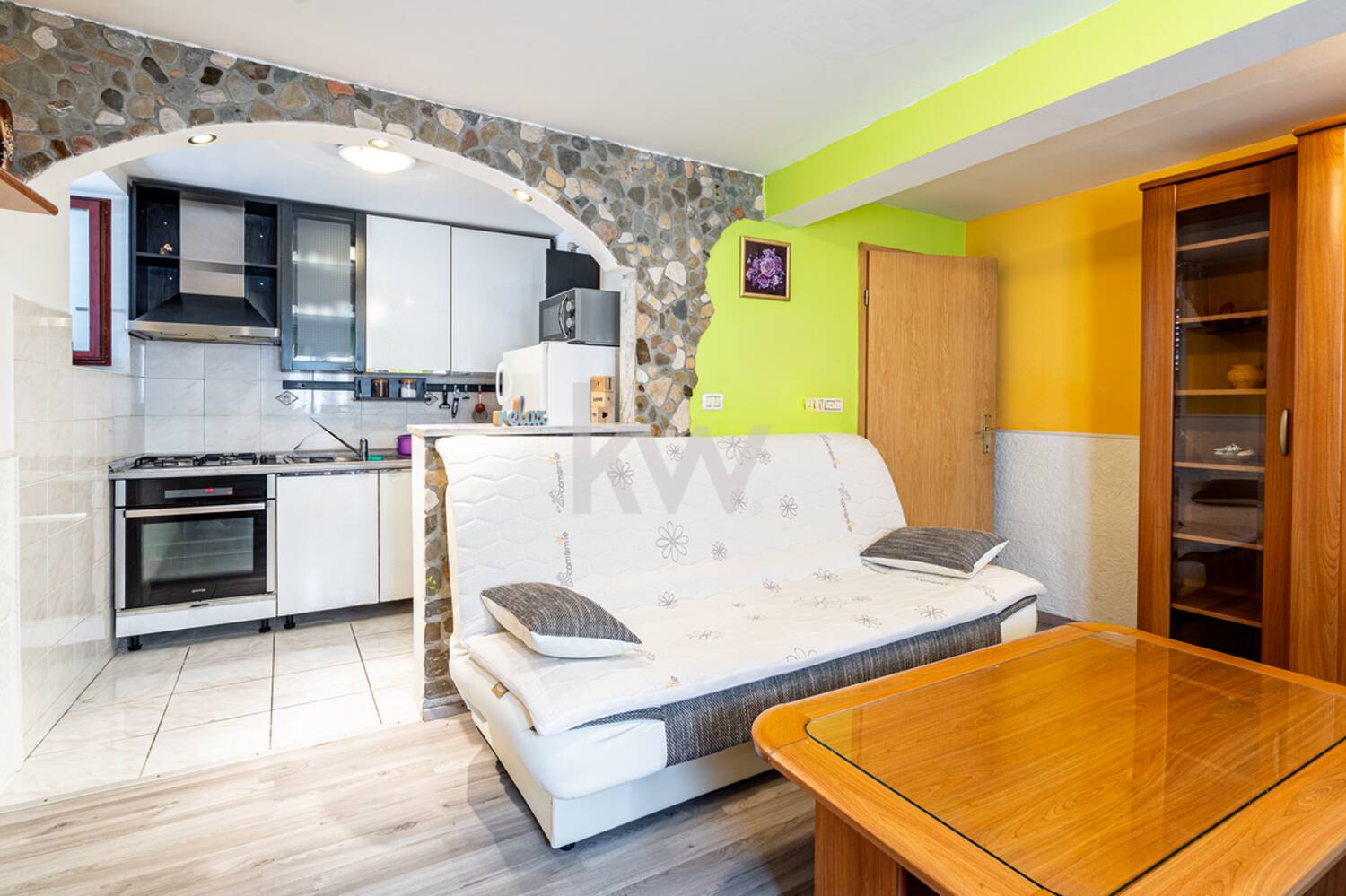 spalnica z garderobno omaro, shramba, prostorno kopalnico in dnevni prostor s kuhinjo.