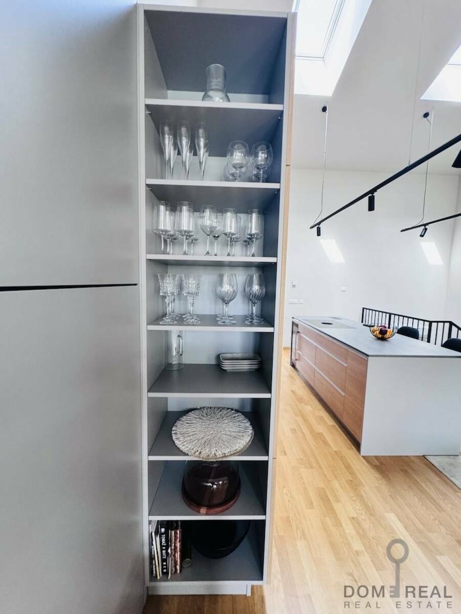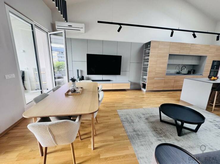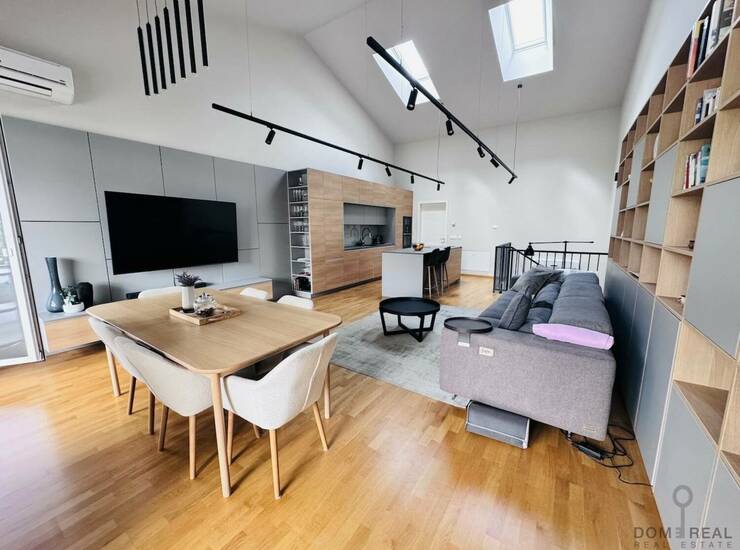 Na voljo so tri prostorne spalnice, dovršeno opremljeni kopalnici, shramba ter dva lastniška parkirna prostora. Oprema je izdelana po meri in zasnovana s pomočjo notranjega oblikovalca, kar stanovanju daje poseben značaj in vrhunski estetski nivo. Ogrevanje je urejeno prek toplotne črpalke, vsi prostori pa so tudi klimatizirani, kar omogoča udobno bivanje skozi vse leto.