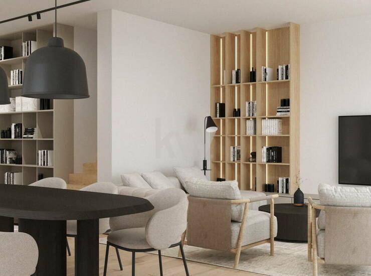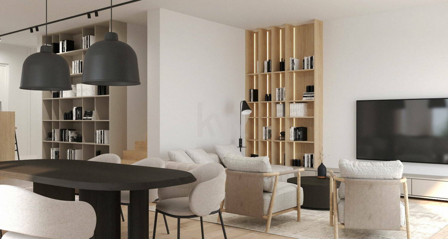 Odprta zasnova pritličja povezuje kuhinjo, jedilnico in dnevni prostor v svetlo in zračno celoto, z neposrednim izhodom na južno teraso – idealno za druženje, letno kuhinjo ali celo bazen.