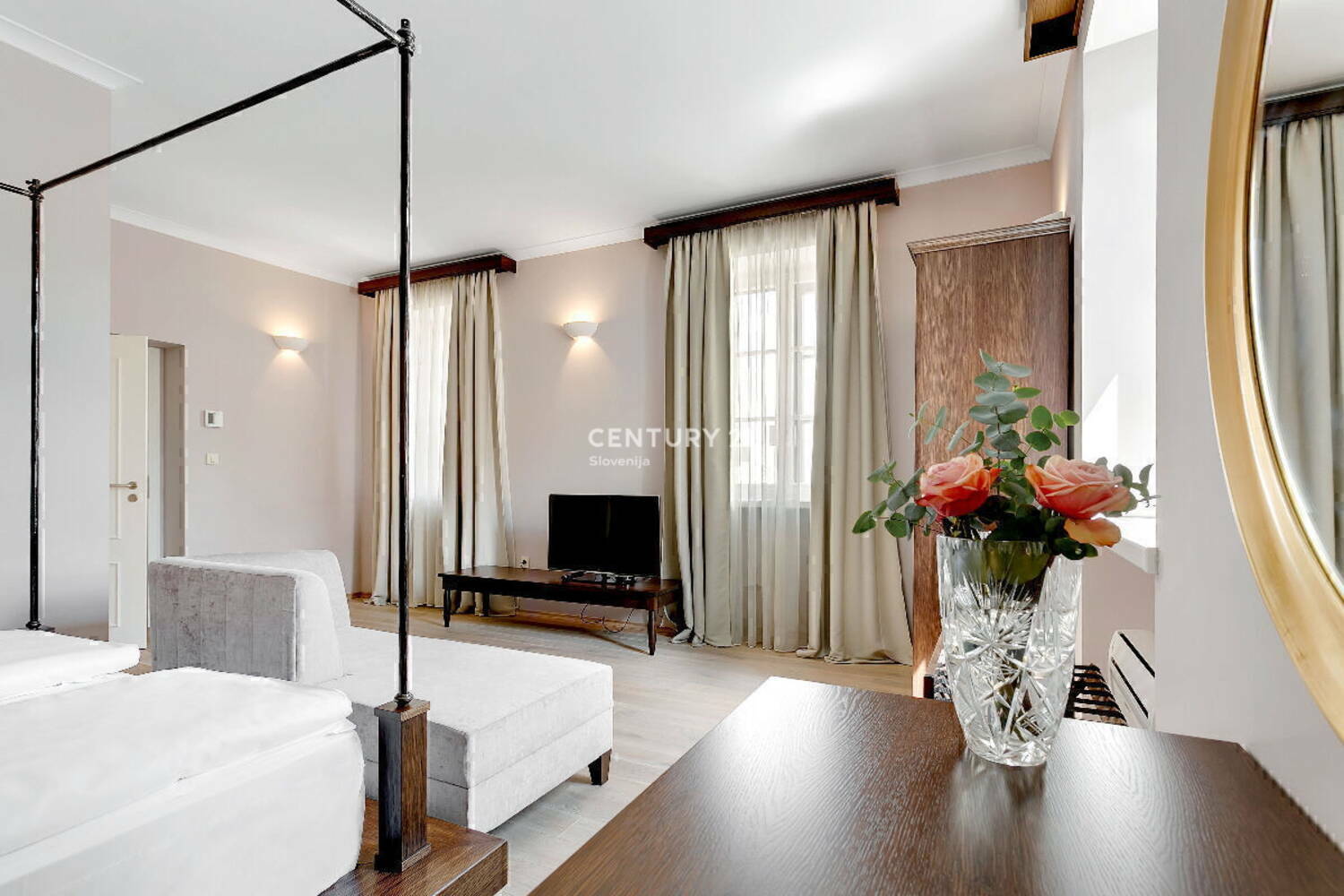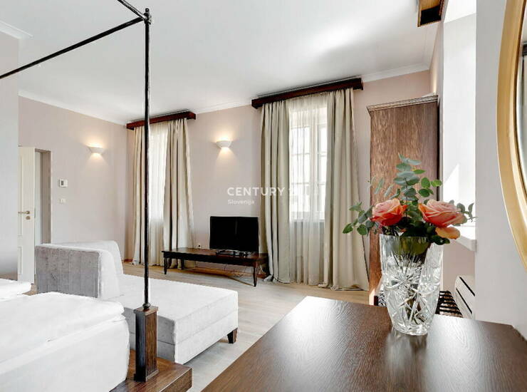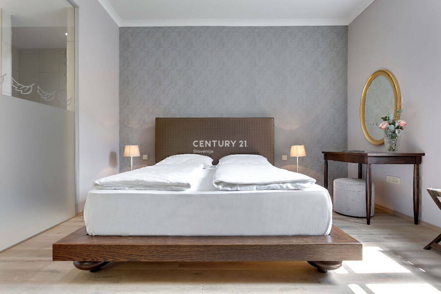 Prestižna zgodovinska vila na otoku – biser Kostanjevice na Krki Na čudovitem otoku, v srcu mesta Kostanjevica na Krki, je naprodaj izjemna meščanska hiša iz konca 19. stoletja, ki je bila leta 2015 popolnoma prenovljena in preurejena v butični mini hotel. Že na prvi pogled očara s čudovito okrašeno čelno fasado, obokanim pritličjem, elegantnimi arkadami na zadnji strani ter z idiličnim notranjim dvoriščem, kjer mogočen kostanj nudi prijetno senco. Zunanje tlakovce krasi lokalni kamen, celotno posestvo pa ustvarja občutek prave mediteranske elegance v osrčju Dolenjske. Vila ponuja ne le izjemno lokacijo, ampak tudi možnost različnih namembnosti – od ekskluzivnega hotela do čudovitega zasebnega doma. Pritličje – prostor za doživetja V pritličju se nahaja prostorna recepcija z obokanim stropom in toplim vzdušjem zaprtih kaminskih ognjev, profesionalna kuhinja, jedilnica oz. zajtrkovalnica ter prijeten prostor za druženje. Na voljo je tudi manjša sejna soba z vinsko omaro in ločeni sanitarni prostori. Vsa oprema je bila zasnovana in izvedena v sodelovanju z arhitektom Goranom Dominkom in podjetjem Stillesa. Prvo nadstropje – eleganca z razgledom Prvo nadstropje ponuja štiri prostorne dvoposteljne sobe z lastnimi kopalnicami. Dve sobi imata izhod na velik balkon, ki se razteza čez celotno nadstropje in nudi miren razgled na notranje dvorišče. Drugo nadstropje – popolno za družine V drugem nadstropju se nahajata dve večji družinski sobi in tri dvoposteljne sobe, vse z lastnimi kopalnicami. V sobe je možno dodati dodatna ležišča. Vsaka od njih ponuja čudovit razgled na mestno jedro in okolico, leseni podi pa ustvarjajo prijetno toplino. Dvorišče in dostop Do vile vodi dostop z glavne ceste (Ulica talcev) in iz stranske ulice. Na notranjem dvorišču je dovolj prostora za 9 zasebnih parkirišč, manjšo zelenico ter pomožni objekt s tehničnimi in skladiščnimi prostori. Parkiranje je možno tudi