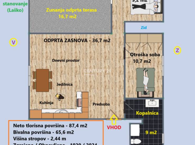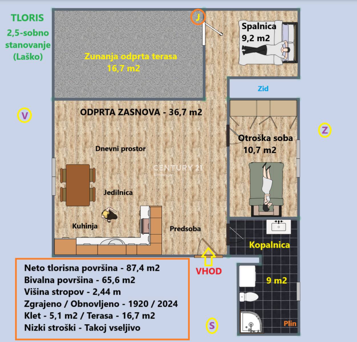 V samem centru Laškega na Trubarjevi ulici imamo na prodaj svetlo in prostorno 3-sobno stanovanje v izmeri 87,4 m2 neto tlorisne površine (65,6 m2 bivalne površine). Stanovanje se nahaja v prvem nadstropju starejše stanovanjsko-poslovne stavbe brez dvigala (4 stanovanja, 2 poslovna prostora) v neposredni bližini Osnovne šole, Pivovarne Laško ter pošte. Pogled iz stanovanja je tako na vzhod kot zahod. Stanovanje ima 16,7 m2 veliko odprto teraso, parkiranje pa je omogočeno prosto pred stavbo (sicer pa z letno dovolilnico). Prostori: open-space prostor združuje predsobo, kuhinjo, jedilnico in dnevno sobo (36,7 m2), prostorna kopalnica (9 m2), otroška soba (10,7 m2) in spalnica (9,2 m2) z izhodom na 16,7 m2 veliko odprto teraso. Višina stropov znaša 2,44 m. Stanovanju pripada še 5,1 m2 velika klet. Video - https://youtu.be/pogRuTTDkBY 360 pogled - https://kuula.co/share/collection/7b1C4?logo=1&info=0&logosize=64&fs=1&vr=1&initload=0&autorotate=-0.3&thumbs=1 Osnovne informacije: Leto gradnje / prenove: 1920 / 2024; Etažnost: K+P+1+M; Gradnja: Klasična gradnja, opečnati zidovi; Fasada: Brez, ometano (l. 2013); Streha (dvokapnica): Zamenjana leta 2013 (opečnata – bobrovec, podeskano in izolirano); Okna/Vrata: Zamenjana leta 2013 (lesena, termopan, dvoslojna); notranja vrata zamenjana leta 2024; Tla: Po tleh je položen nov, kvaliteten laminat ter keramika (Gorenje) v kopalnici (L. 2024); Kopalnica: Komplet prenovljena leta 2024 (zamenjane so bile cevi in odtoki, Kolpasan tuš kabina, Armal kopalniška armatura); Električna napeljava in omarica: Zamenjana leta 2024; Dvigalo: Ne (1/2 nadstropje); Radiatorji s termostatskimi ventili: Zamenjani leta 2024; Ogrevanje: Ogrevanje objekta je izvedeno na zemeljski plin. Stanovanje se ogreva z lastno, etažno, plinsko pečjo nameščeno v kopalnici (Vaillant), s katero se vrši ogrevanje prostorov preko radiatorjev ter tople vode; Telekomunikacije: Telefon (priprava za optiko, ki je