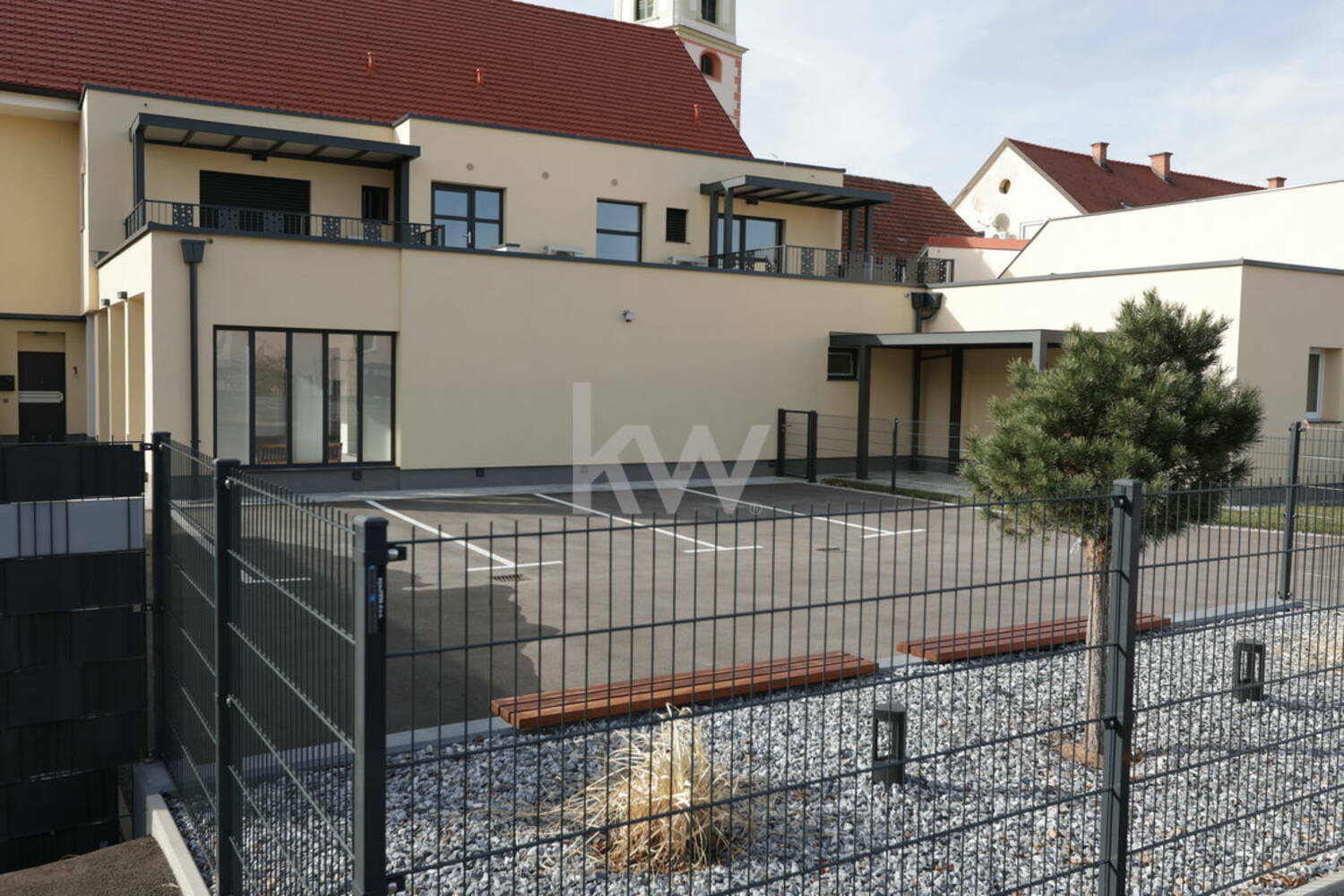 Celoten kompleks vile je ograjen, osvetljen in varovan z video nadzorom. Vanj se vstopa z daljinskim odpiranjem, notranje dvorišče opremljeno s klopmi omogoča stanovalcem druženje in bivanje na prostem. Parkirišče je varno in urejeno, prav tako izhodi na ulico. Opremljeno je s polnilno postajo za električne avtomobile. Prav tako je stanovalcem na voljo skupna kolesarnica.