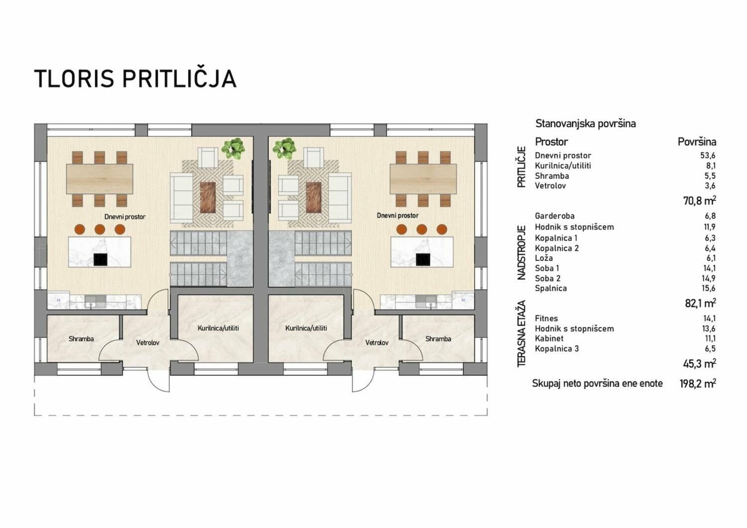 Dvojčka sta zgrajena v treh etažah P+1+T, vsaka enota z neto površino v izmeri 198,2 m2, na od 270 do 317 m2 veliki parceli, ki sestoji iz stavbišča, atrija/zelenice, dveh parkirnih mest in dvorišča z dovozom.