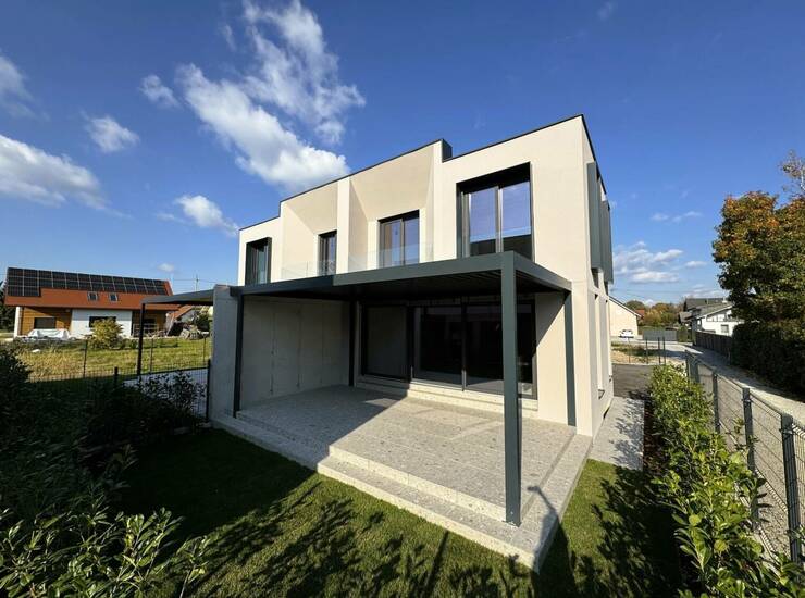 Zunanji prostor: zasajen atrij okoli objekta (trava, lovorikovci), pokrita terasa (bioklimatska pergola), položena keramika na buzonih, asfaltiran dovoz, panelna ograja;
