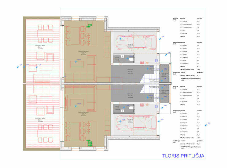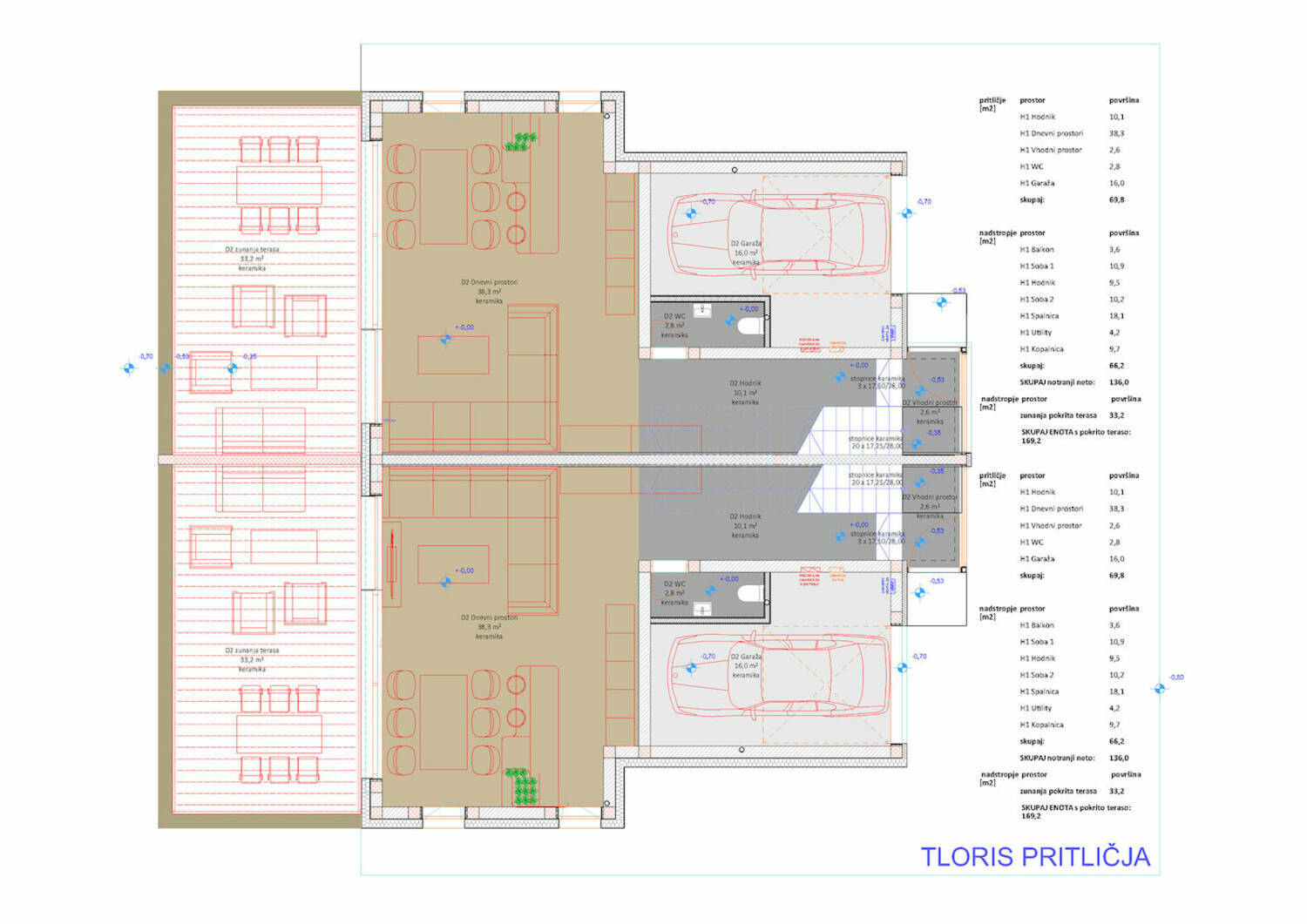Leva enota H1 obsega 169,20 m2 od tega 136 m2 notranje površine in zunanja pokrita terasa 33,2 m2. Etažnost P + N (pritličje in nadstropje + možnost T) z višino stropov 2,70 m.