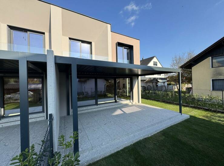 Zunanji prostor: zasajen atrij okoli objekta (trava, lovorikovci), pokrita terasa (bioklimatska pergola), položena keramika na buzonih, asfaltiran dovoz, panelna ograja;
