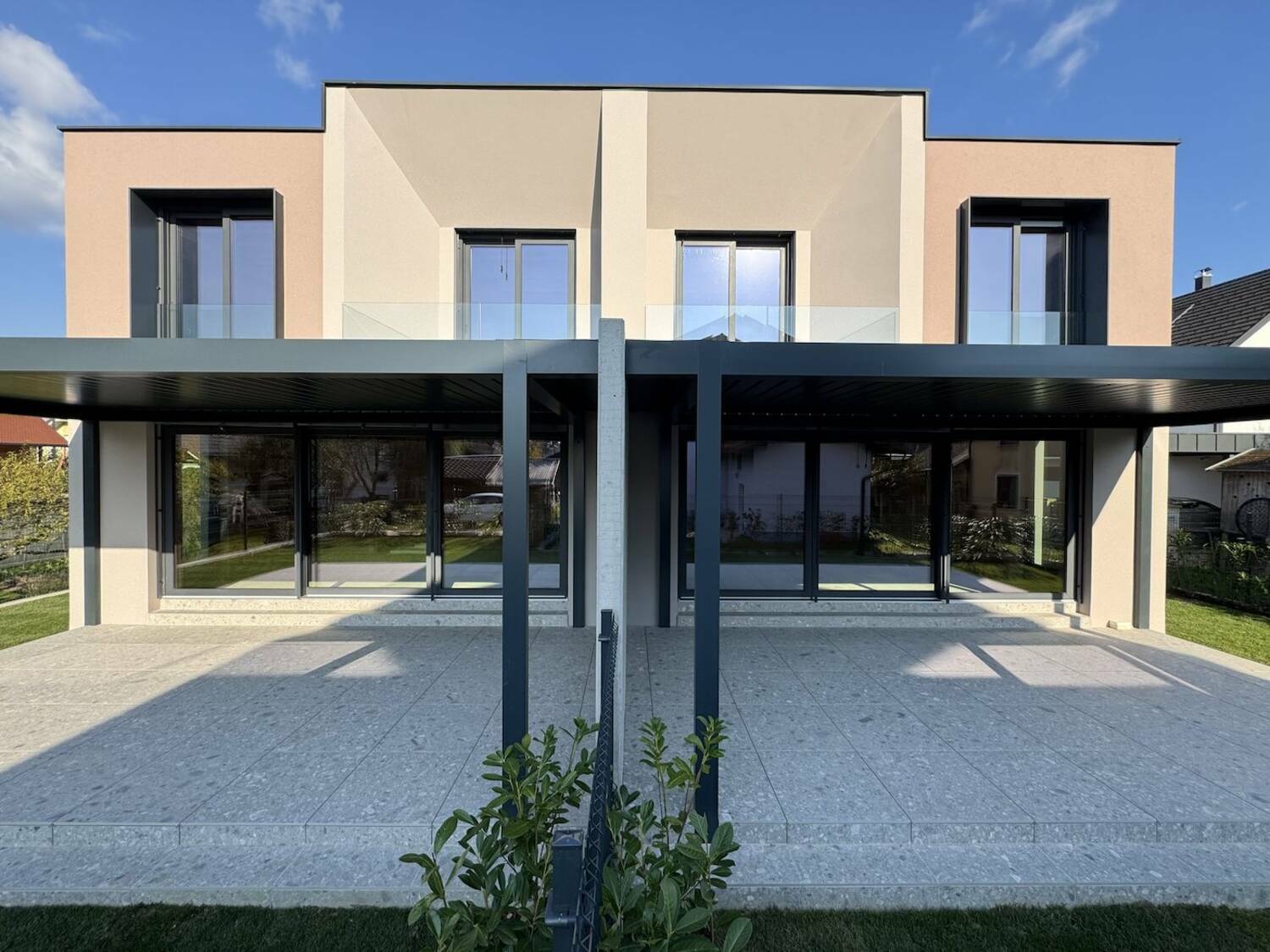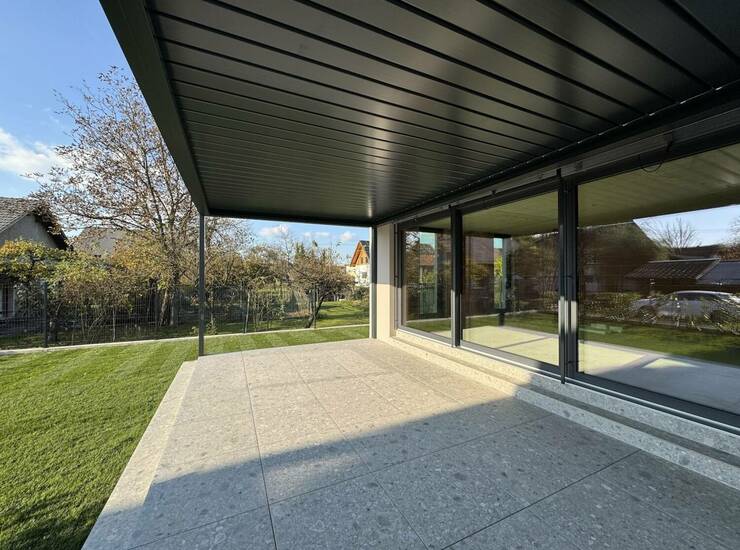 Zunanji prostor: zasajen atrij okoli objekta (trava, lovorikovci), pokrita terasa (bioklimatska pergola), položena keramika na buzonih, asfaltiran dovoz, panelna ograja;