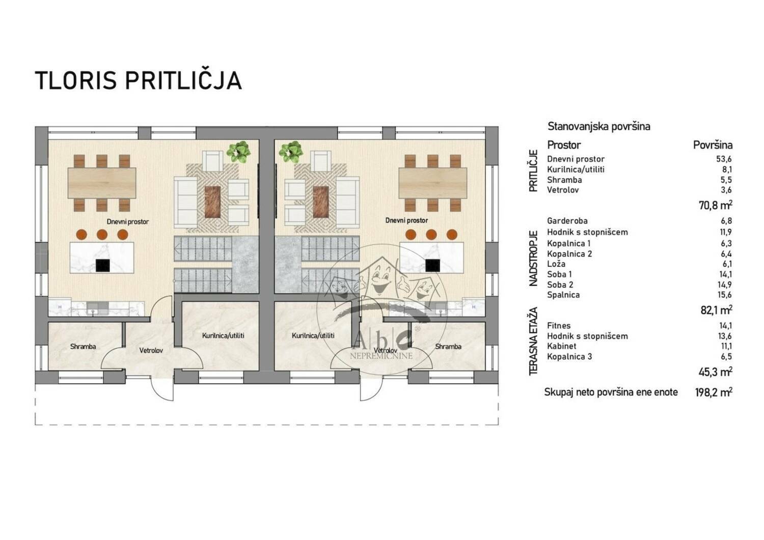 Vsaka hiša meri 198,2 m2. Zemljišče je velikosti 317,1 m2.
