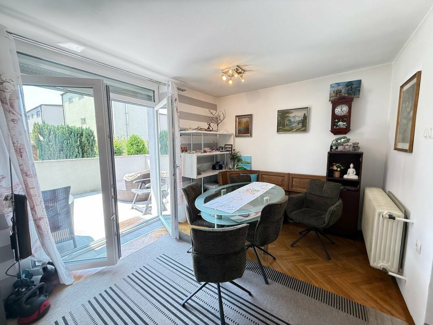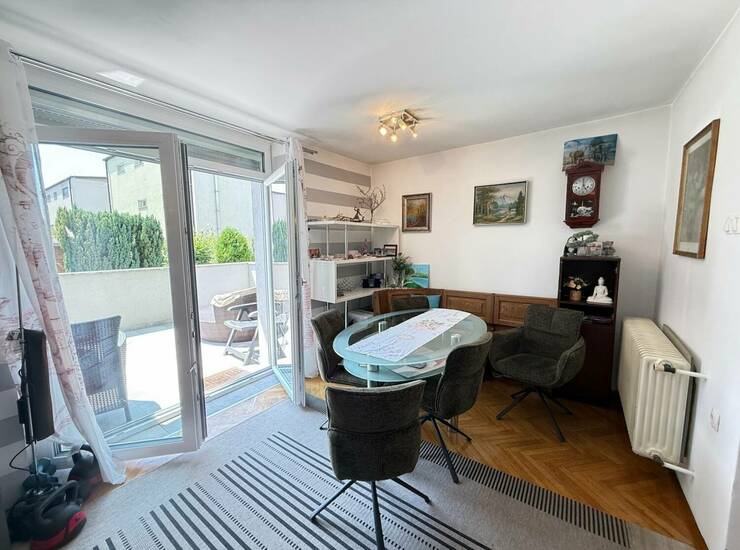 Svetel dnevno-bivalni prostor s kuhinjo in izhodom na odprto teraso