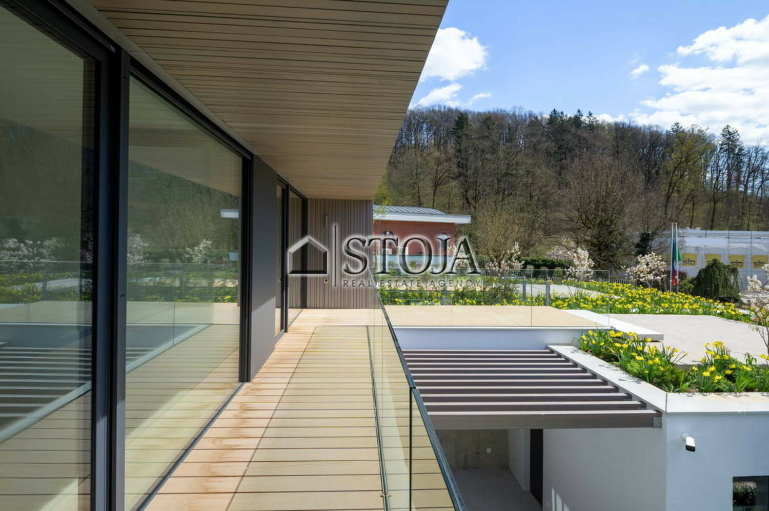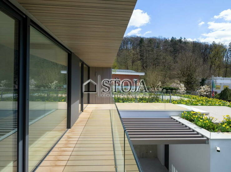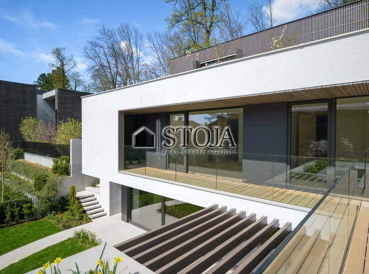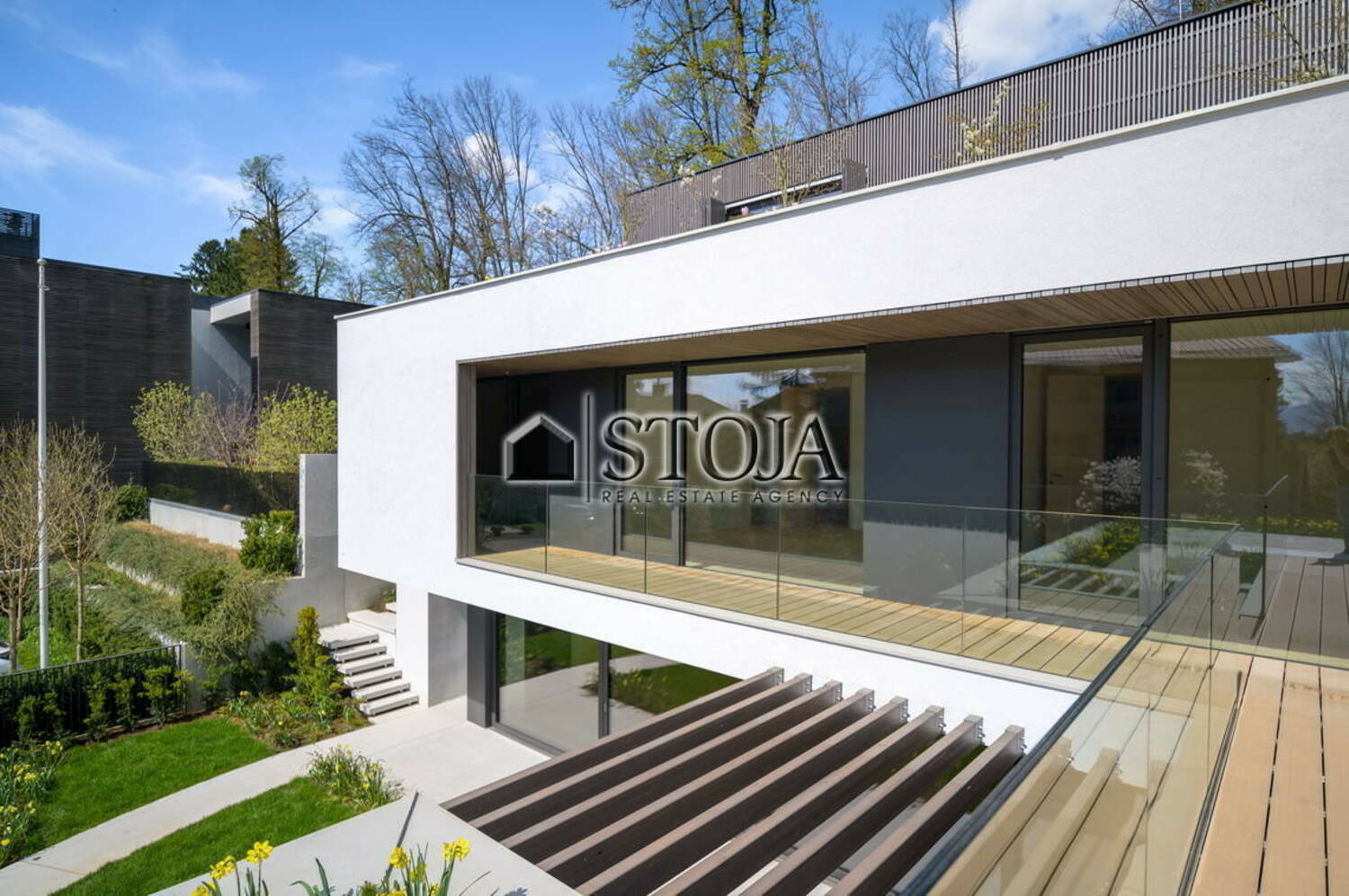 Prestižna Vila s fantastičnim razgledom na Rožno Dolino in hribovjem Krima.Pravkar dograjena prestižna reprezentativna vila v zelenju v neposredni bližini Tivolija in centra mesta, z izjemnimi pogledi na Rožnik kot tudi proti gori Krim. Uporabno dovoljenje pridobljeno.Lokacija:Skoraj v centru mesta ob Rožniku se nahaja luksuzna pravkar dokončana vila s čudovito zasajenimi vrtovi v treh nivojih in osupljivim razgledom s terase, ki seže vse do Krima. Ta luksuzna nepremičnina se nahaja na izjemni lokaciji v okolišu podobnih prestižnih vil in le 7 min peš do Cankarjevega doma ter ima na hrbtni strani svoj zasebni izhod na pešpot in trim stezo od Tivolija proti posestvu Čad.Opis & razporeditev vile, katera ima tri etaže:- pritličje z odprtimi bivalnimi prostori na intimni vrt, velika garaža 40 m2 s 5 metrskimi garažnimi vrati + 3 parkirna mesta,- prvo nadstropje s 3 sobami povezanimi z zazelenjeno teraso in vrtom, ki ima direktni izhod na sprehajalnopot za hišo ter atraktivno,- terasno etažo z modernim odprtim tlorisom in veliko zasebno teraso s čudovitim pogledom na Krim in gozd. Vila ima 5 dizajnersko opremljenih kopalnic, premišljeno vgrajene knjižne omare, vsaka soba ima izhod na loggio in naprej na luksuzno zasajene vrtove.Površine & prostori vile: Terasa: 3xLoggie: 3xSpalnice: 4x (lahko tudi 5)Sobe (vse skupaj):7Kopalnice: 5xGarderobne sobe: 1xShrambe: 3xDnevna soba ima dizajnersko oblikovan kotiček s kaminom, ki je povezan s savno. Vrata so nadstandardne višine in vsi vgrajeni materiali so naravni in skrbno izbrani. Tehnološka oprema je visoke kvalitete in vila je praktično samooskrbna.Vila, ki je delo vrhunskega arhitekturnega biroja, očara s svojo premišljeno zasnovo, izjemno svetlostjo in prečudovitimi pogledi na z letnimi časi spreminjajoče se vrtove, ki jih je zasnovala priznana hortikulturnica.Tehnična oprema hiše:toplotna črpalka ima kapaciteto 15kWh,plinska peč in pripravljen plinski priključek,sončna elektrarn