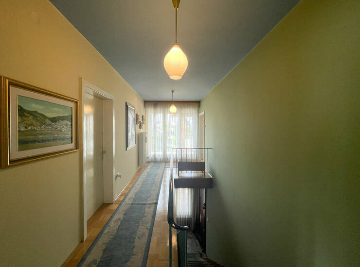 V nadstropju se nahajajo: hodnik s stopniščem, dve spalnici od katerih je iz ene izhod na veliko teraso, kopalnica z wc-jem, kuhinja z jedilnico in velika dnevna soba z izhodom na balkon.
