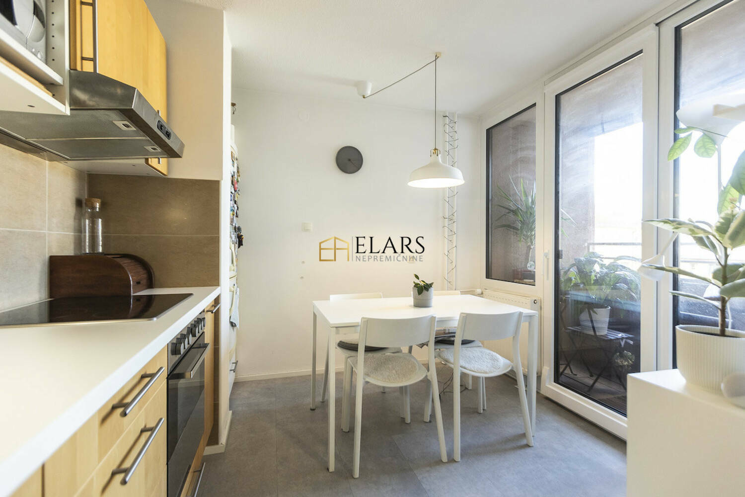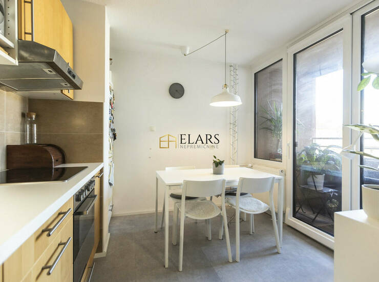 Kuhinja z jedilnico in izhodom na prijeten balkon, ki nudi miren kotiček za jutranjo kavo ali večerni počitek