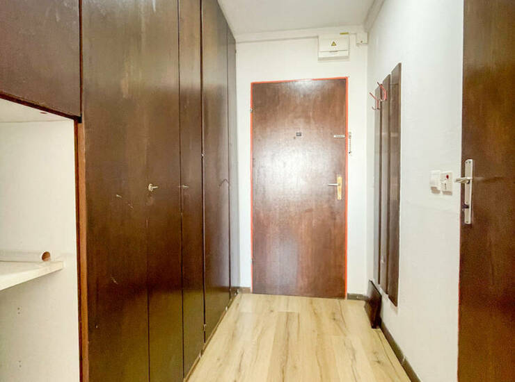 Stanovanje skupne neto površine 19,22 m2 obsega sobo, hodnik in kopalnico s tušem in wc-jem.