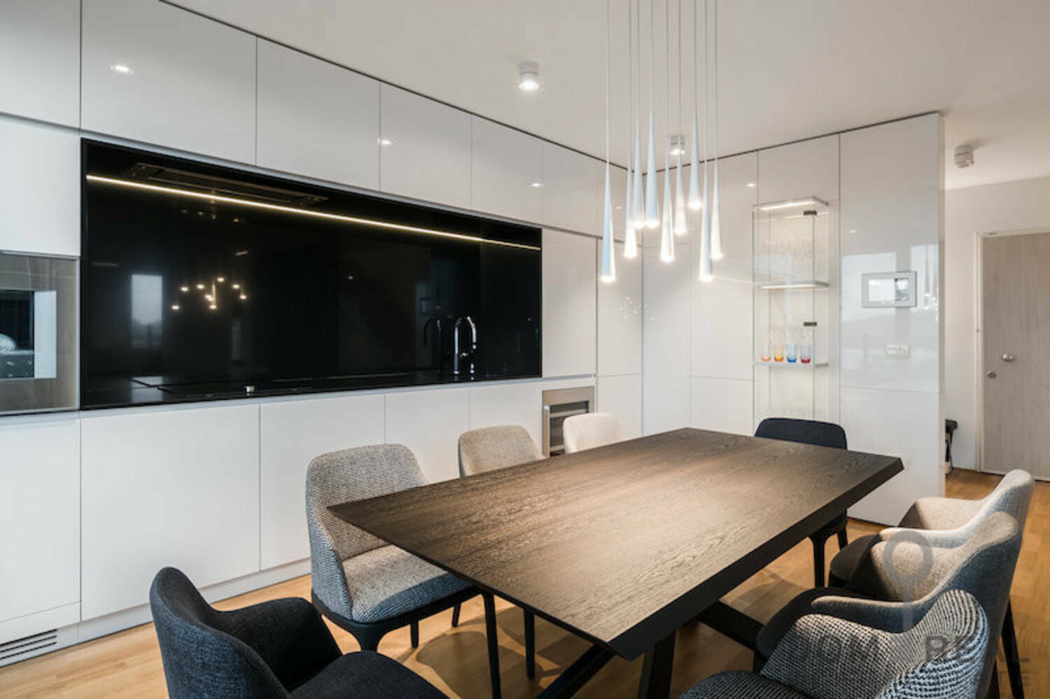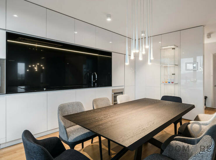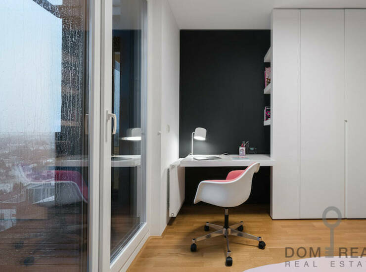 Stanovanje sestoji iz open space dnevne sobe, kuhinje in jedilnice;v pritličnem delu je še utility, terasa in sanitarije, v nadstropju pa so locirane zakonska spalnica s svojo kopalnico in dve otroški sobi s kopanico.