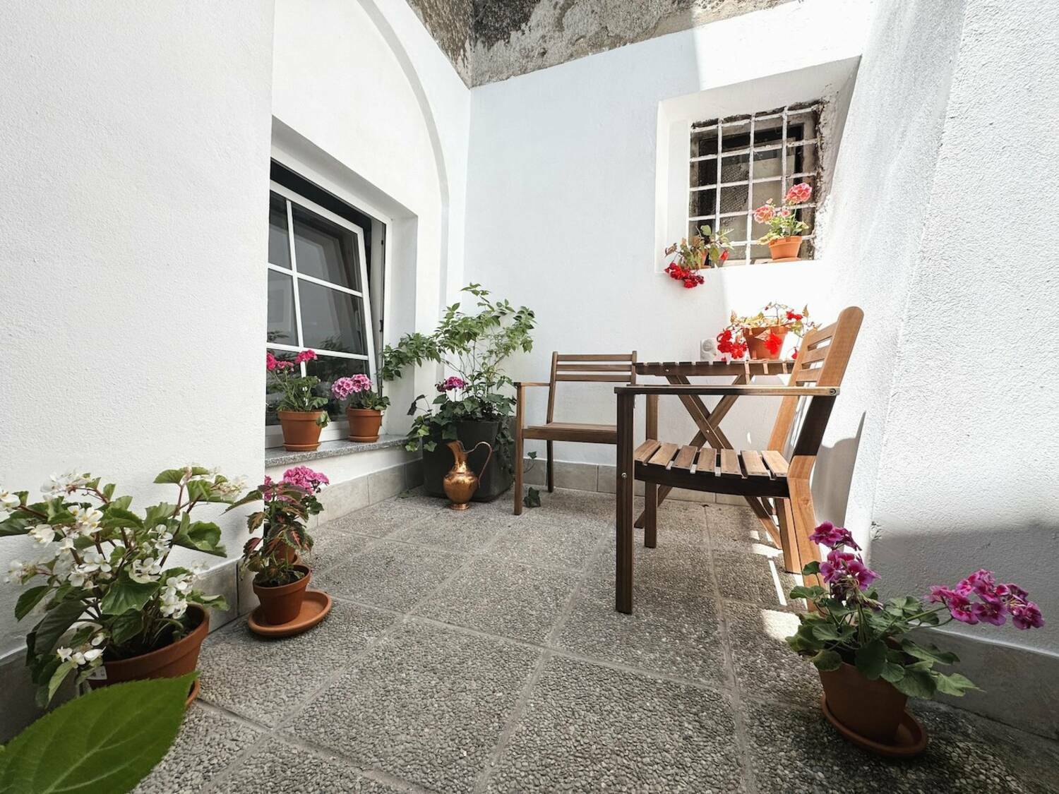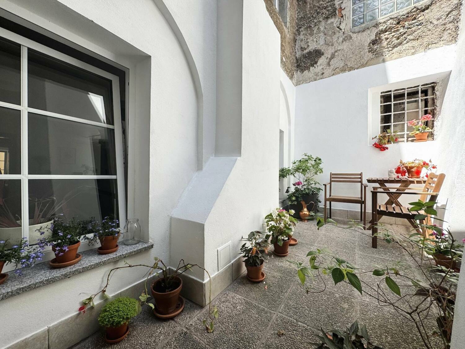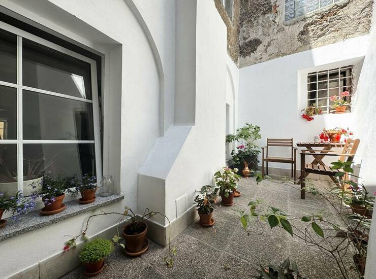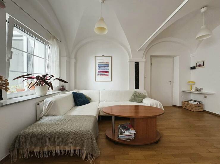 Vhod v stavbo krasijo lepa stilizirana staromeščanska vrata, ki se odpirajo v značilno kamnito in prostorno vežo, kjer stanovalci puščajo kolesa. Lesene stopnice vodijo v prvo nadstropje, iz razkošne avle pa nekaj stopnic vodi v stanovanje. Vrata se odprejo v prostoren hodnik, ki omogoča veliko prostora za shranjevanje. Na levi strani hodnika je dnevnobivalni prostor ter dve spalnici, na desni pa kopalnica. Naravnost vodijo steklena vrata v kamnit obokan prostor s strešnim oknom, ki ga lahko uredite v čaroben letni vrt ali v delovno sobo. Odtod vrata vodijo na prikupen zunanji kotiček, ugreznjen med zgodovinske zidove z veliko zasebnosti in obokanim prostorom v surovem stanju, kjer si lahko uredite shrambo ali vinsko klet.