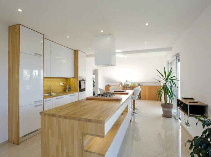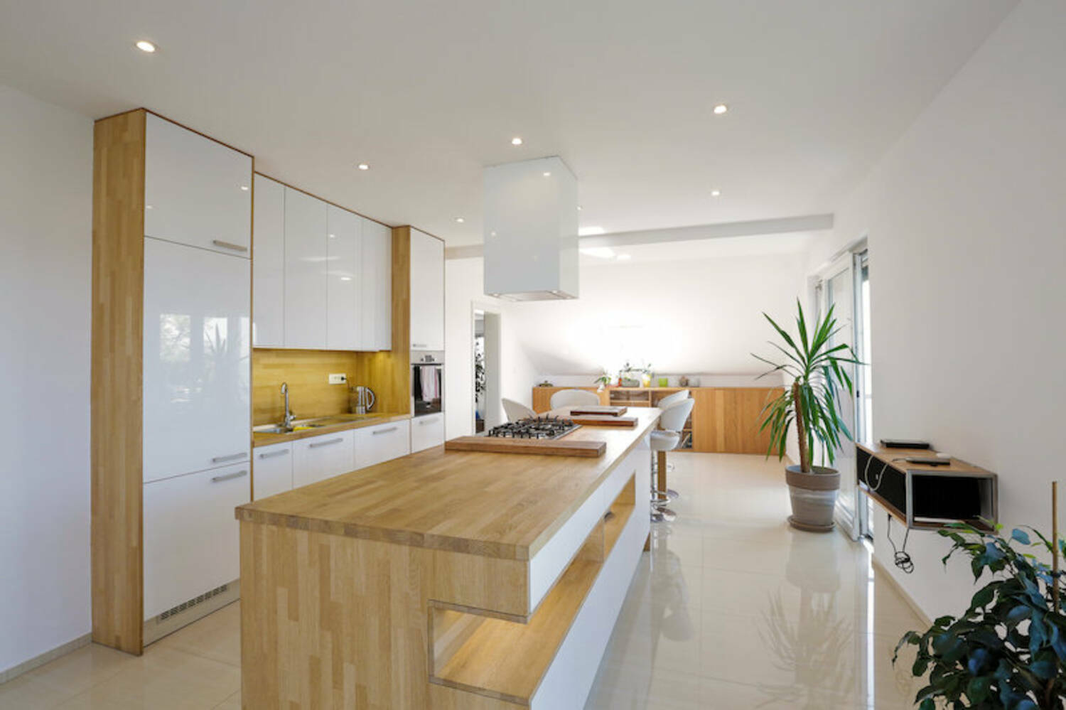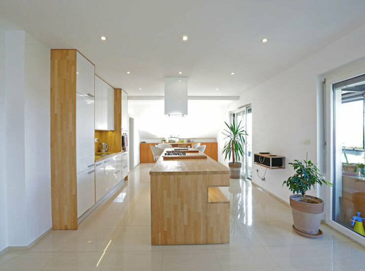 dnevni prostor s kuhinjo z jedilnim prostorom v enem z izhodom na nadkrito teraso