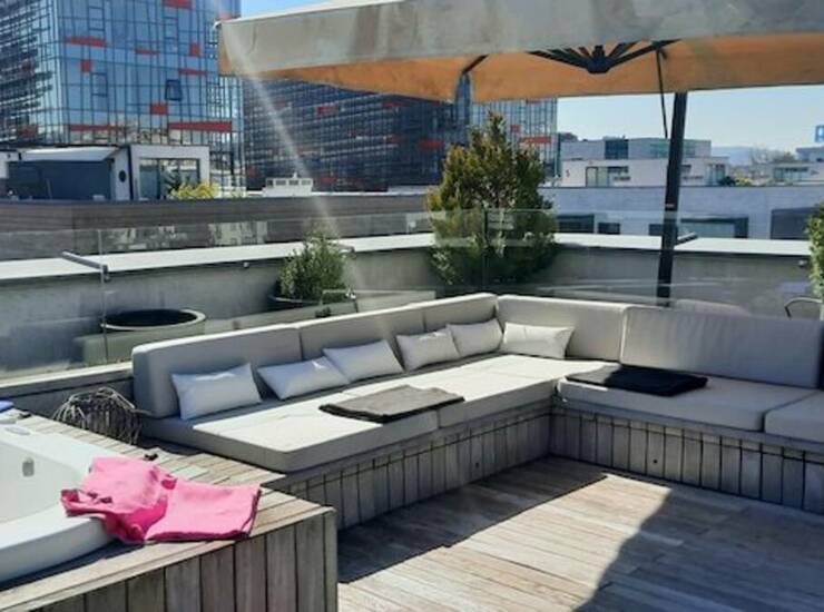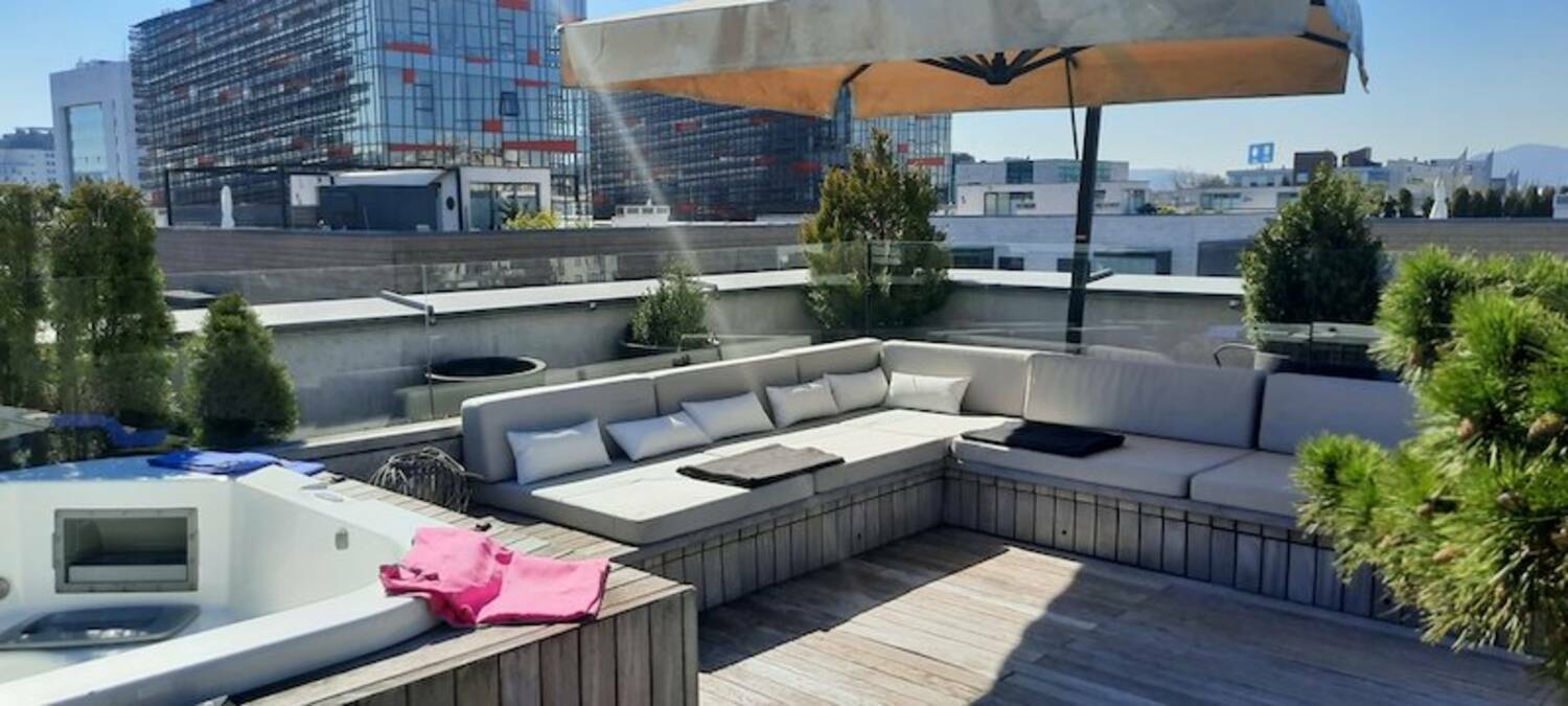 Lastniška terasa na vrhu objekta je v tropskem lesu. Ima pomično streho, popolnoma opremljeno letno kuhinjo, kuhalno ploščo, žar, dva hladilnika, toplo vodo. Na ograjeni terasi so jacuzzi, velik TV ekran, veliko oblazinjene površine za sedenje ter ležanje, senčnik, ambientalni avdio sistem, ponoči je prostor romantično osvetljen. Teraso si lahko ogledate na povezavi: https://youtu.be/WHYgNWDVlGU