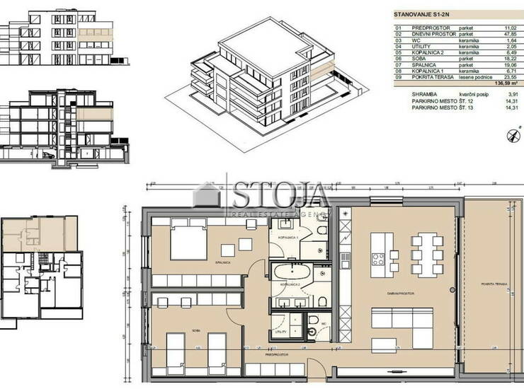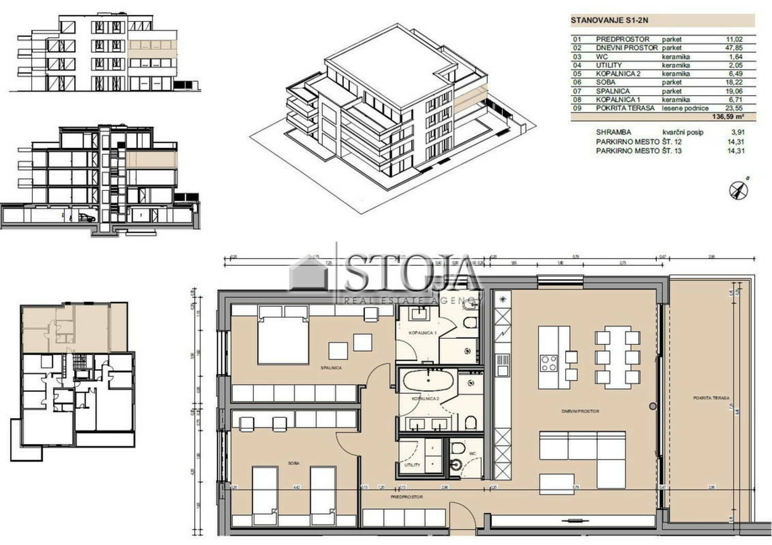 ZAVIDANJA VREDNO STANOVANJE S POPOLNIM KOMFORTOM. Varnost bivanja na najvišji stopnji.Samo za tiste, ki si želijo privoščiti vrhunsko izdelano stanovanje locirano v neposredni bližini Tivoli parka in Centra mest, imamo samo še nekaj najboljših stanovanj na voljo. Želite živeti v bolj intimnem okolju, potem zgrbite priložnost. Samo 10 stanovanj je bilo narejenih in polovica je že prodanih.Stanovanje im 113.4 m2 (neto) oziroma 136.59 m2 (bruto) povoršine, specifikacija je vidna na skici stanovanja.Težko je na kratko opisati vso tehnologijo, ki je vgrajena v ta vrhunski stanovanjski objekt. Mogoče lahko celo rečemo, da ima vse, kar danes tehnologija ponuja.Končni videz objekta bo dejansko tak kot ga lahko vidite na vizualizaciji, ter ga boste lahko prvič v živo videli oktobra 2024.Vseljivo bo Junija 2025Kot smo že prej omenili je objekt tehnološko dovršen in tu je nekaj naštete tehnologije: talno in stensko ogrevanje, stropno in stensko hlajenje, nič pihanja in vedno idealna temperatura, prezračevanje z vračanjem toplote, vedno idealna vlažnost filtriranega zraka, ter nizki stroški ogrevanja in hlajenja, sistem pametne hiše Gira (nadzor stanovanje iz vašega telefona, kjer koli že ste), parkirna mesta z napeljavo za električno polnilnico, kontrola dostopa na vhodu, varnost od ulice naprej, obešena prezračevana fasada, z 20cm izolacije, (vedno lepa fasada), alu 3 slojna panoramska okna za tišino in veliko svetlobe, zunanje senčenje na električen pogon, (screen in polkna) avtodvigalo za dostop do komfortne garaže, parket, oljen hrast, položen na ribjo kost 90 stopinj – prva klasa vrhunska kopalniška - design opremaKot pri opremi objekta z tehnološko dovršenimi rešitvami in izbranimi materiali, je investitor predvidel tudi razkošno velika parkirna mesta z veliko višino stropa garaže. Zato lahko tudi z terenskim vozilom, katero ima strešni kovček, parkirate v svoji garaži. Okolica vile bo