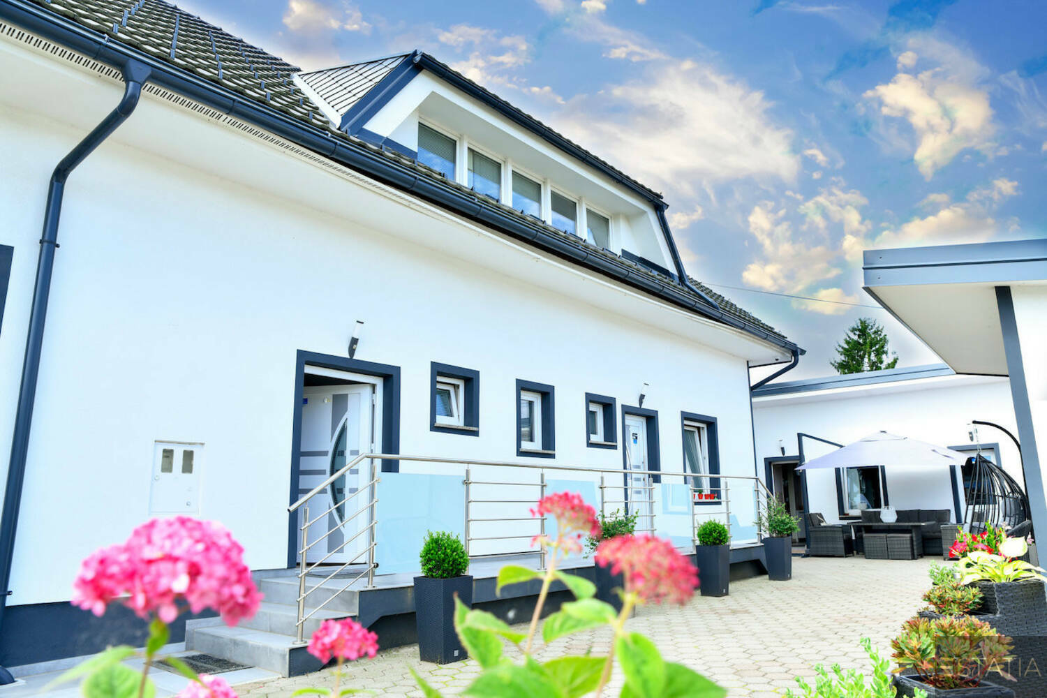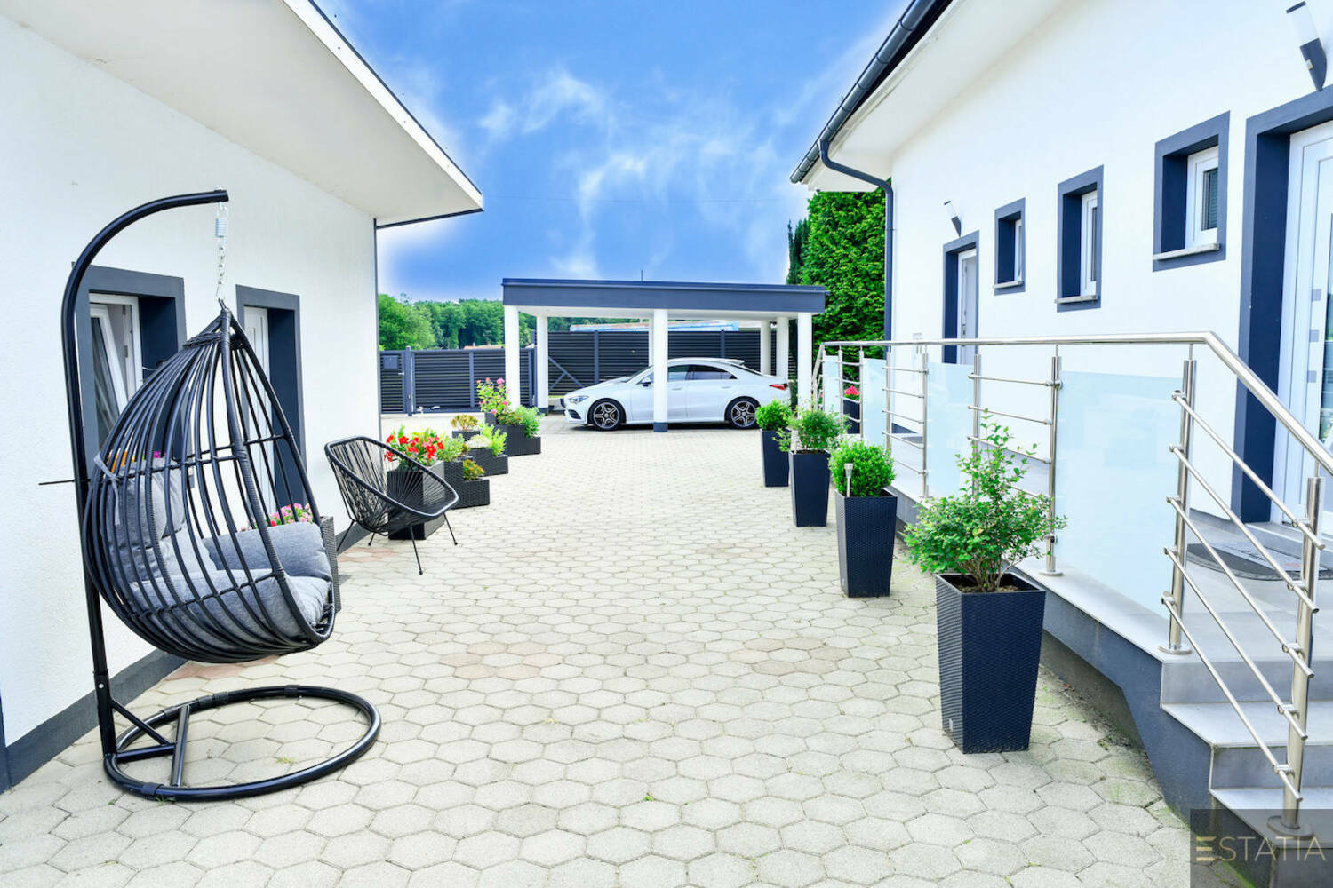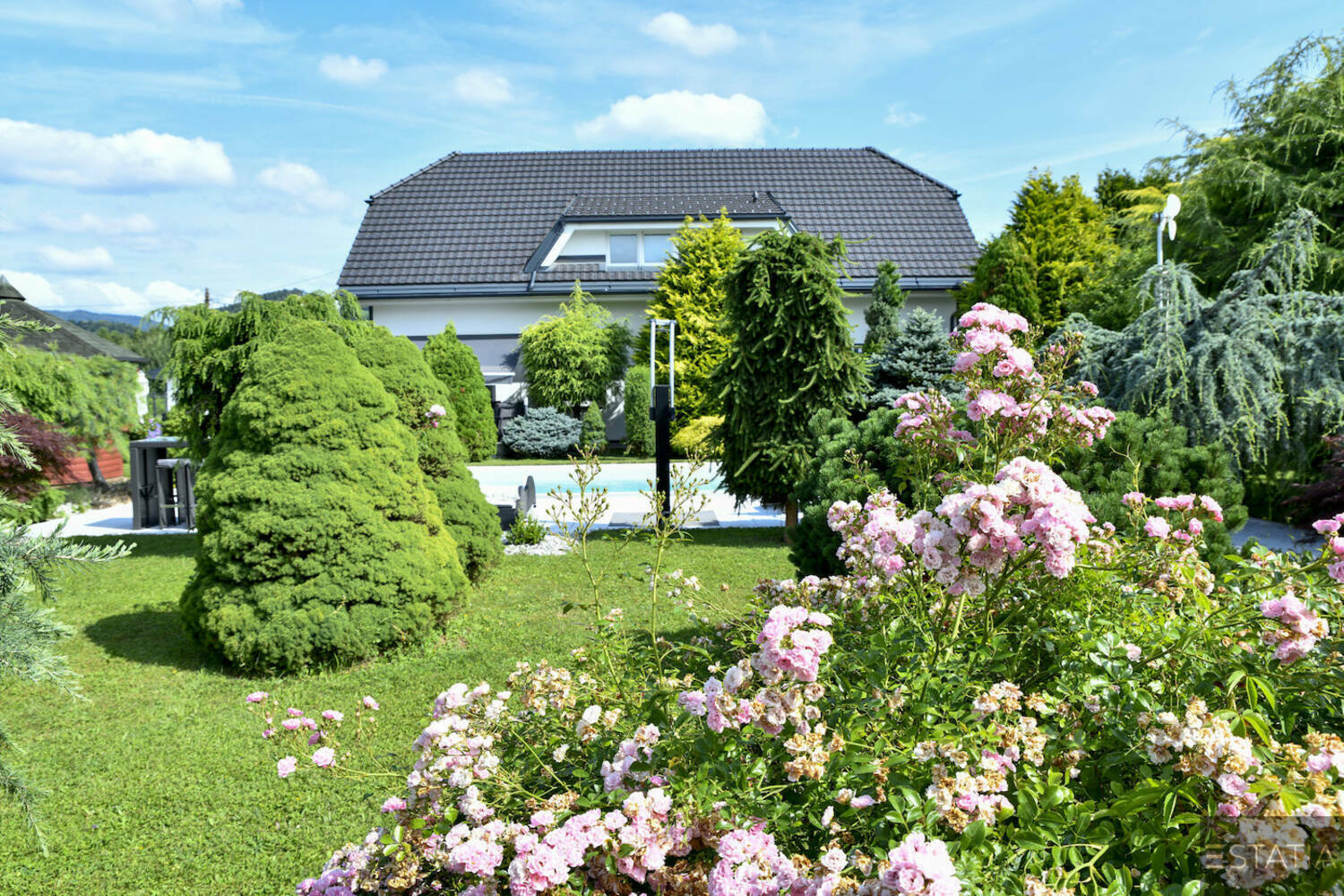 ponaša se s prostornim parkom s skrbno izbranimi drevesi z različnih koncev sveta in nadkritimi ter odkritimi kotički za posedanje in vrtno lopo