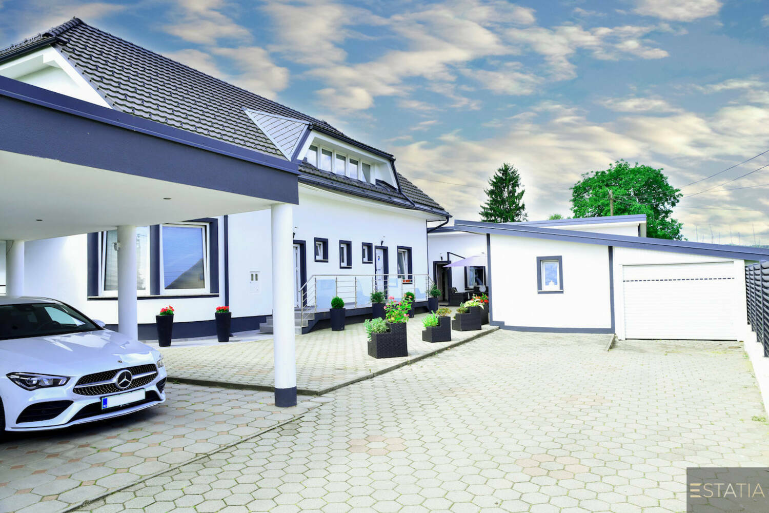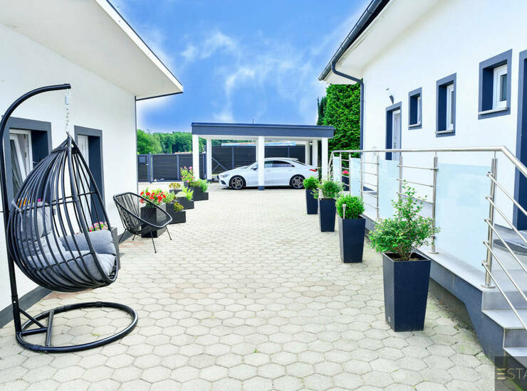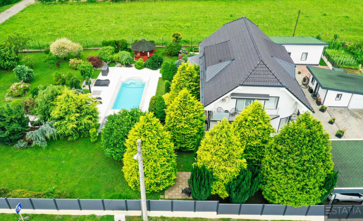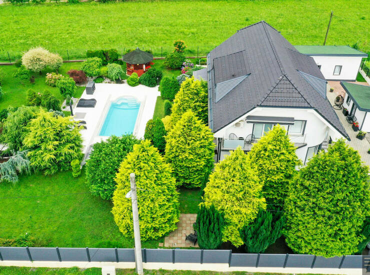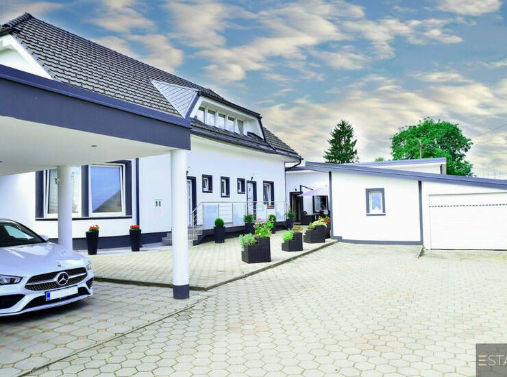 Na zeleni posesti velikosti 2.028,0m2 se nahaja lepo urejena ter vzdrževana hiša 329,7m2 z bazenom, poslovni objekt s tehničnim delom 70,2m2, mini studio 34,8m2 ter nadstrešek za 3 parkirna mesta 34,3m2.