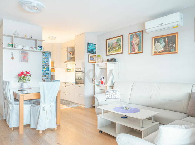 Dnevni prostor in spalnica s hrastovim parketom, kuhinja, predsoba in kopalnica s keramiko