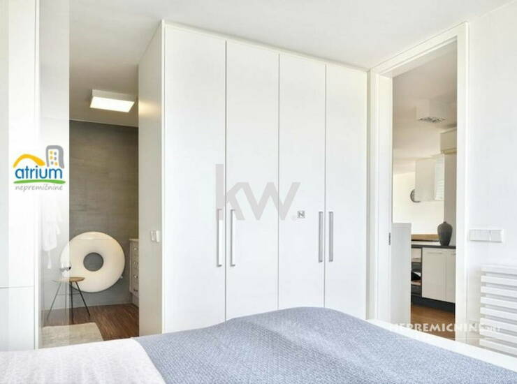 Ob vstopu v spalnico zagledate strukturirano keramiko 80x80 cm naravne bež barve položeno na stik, zasebni balkon ter zasebno kopalnico s posebno stensko keramiko 40x80 cm barve antracit, prav tako položeno na stik. Čez celotno steno kopalnice se razteza ogledalo pod katerim se nahajata umivalnika KERASAN, prav ima kopalnica prezračevalni sistem, dizajnerski radiator ZERO OTTO v obliki piškota (cookie) ter položen mozaik naravnih kamenčkov s pogreznjenim steklom v prostoru za tuširanje.